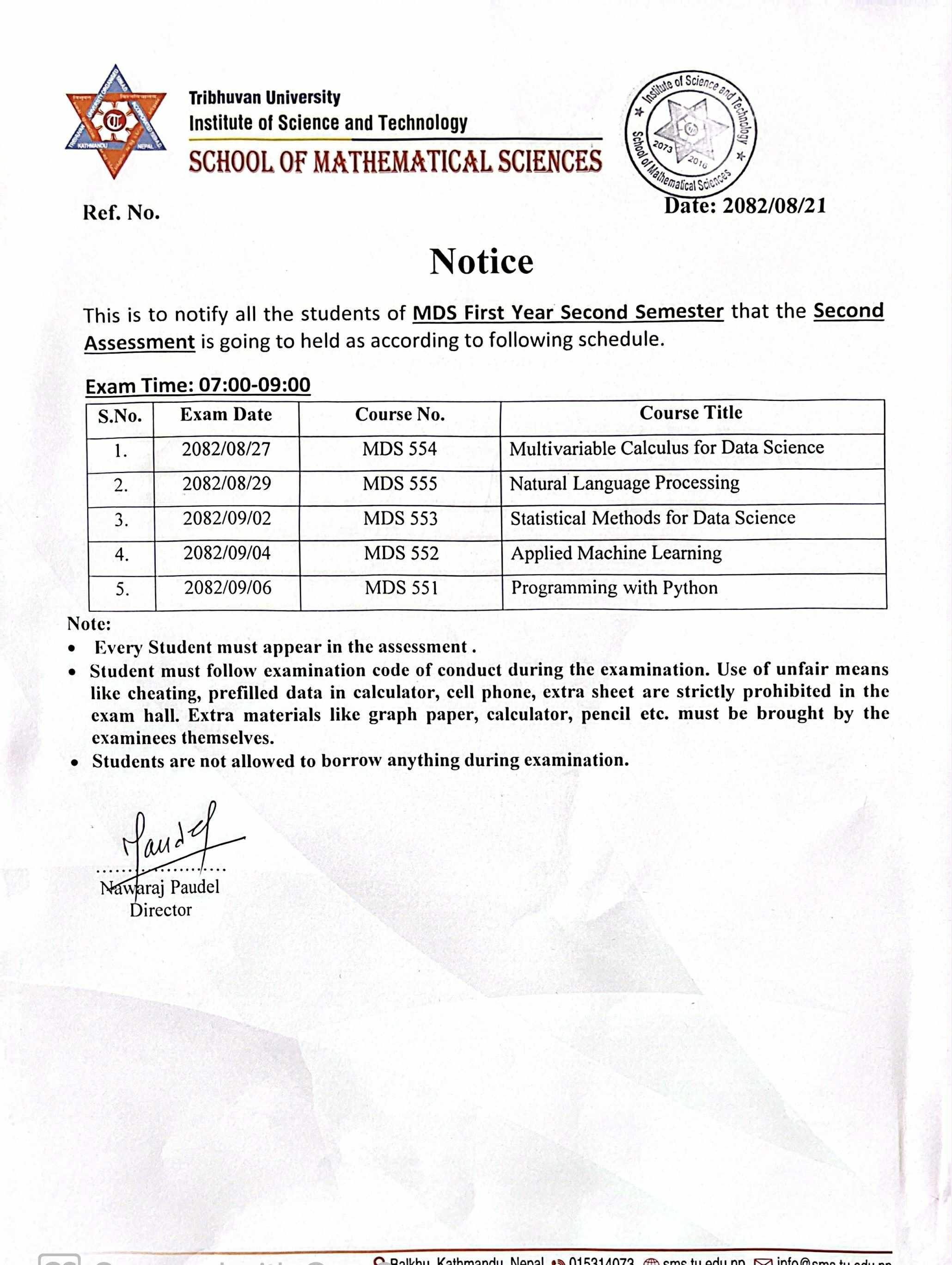 MDS Second Semester Second Assessment Exam Schedule 2082