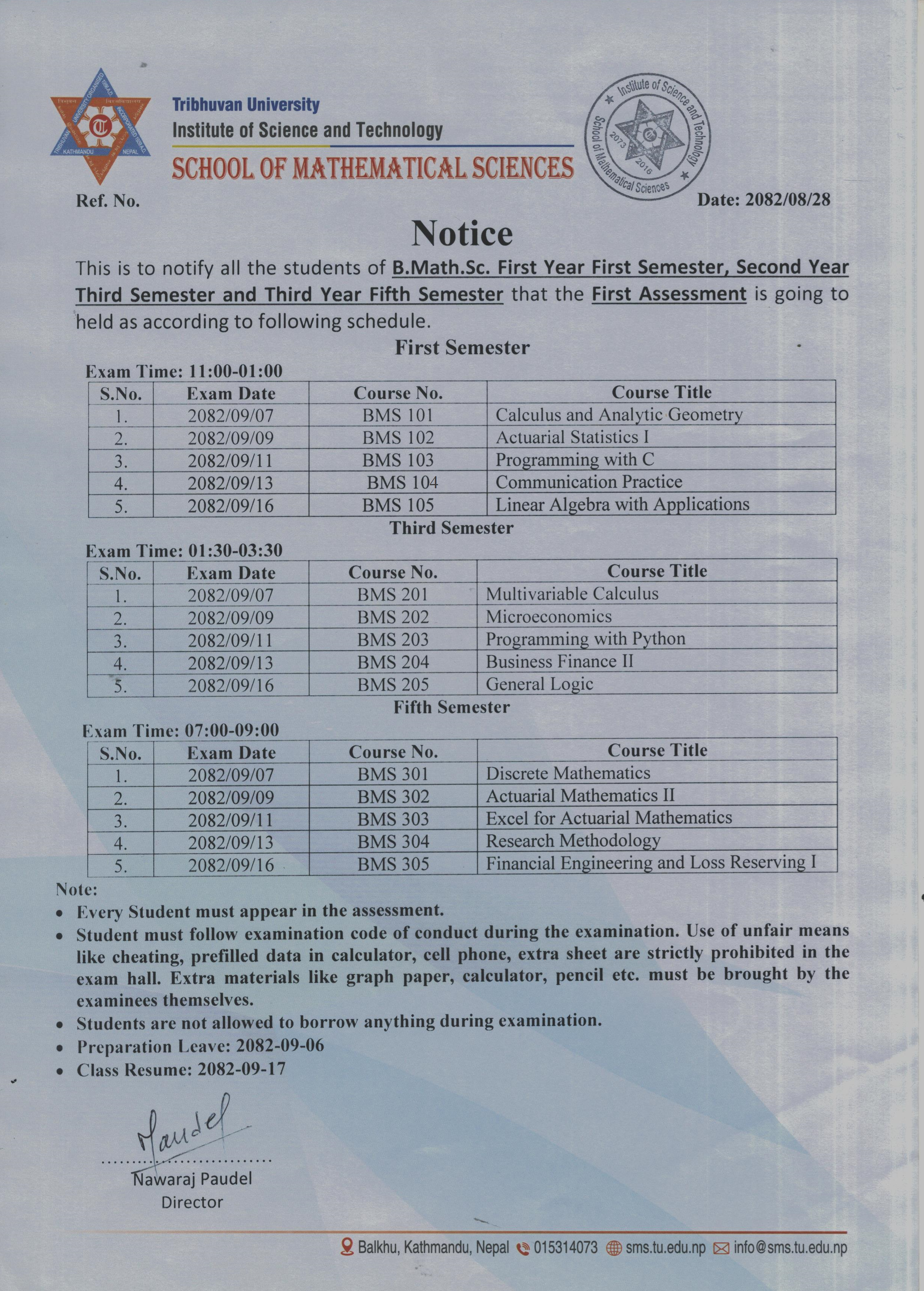 B.Math.Sc. First Year First Semester, Second Year Third Semester and Third Year Fifth Semester First Assessment Exam Schedule 2082