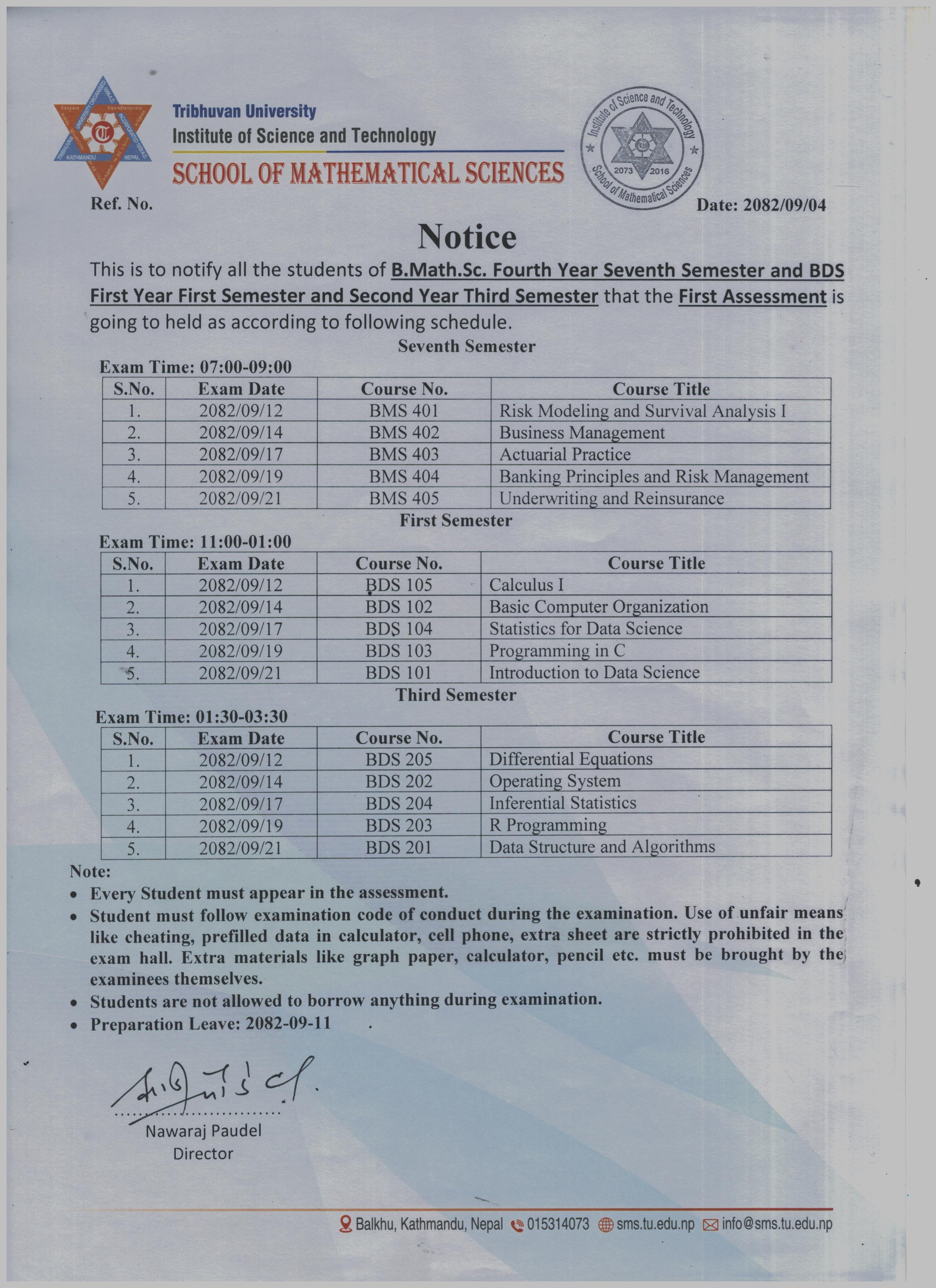B.Math.Sc. First Year First Semester, Second Year Third Semester, Third Year Fifth Semester and Fourth Year Seventh Semester Second Assessment Exam Schedule 2082