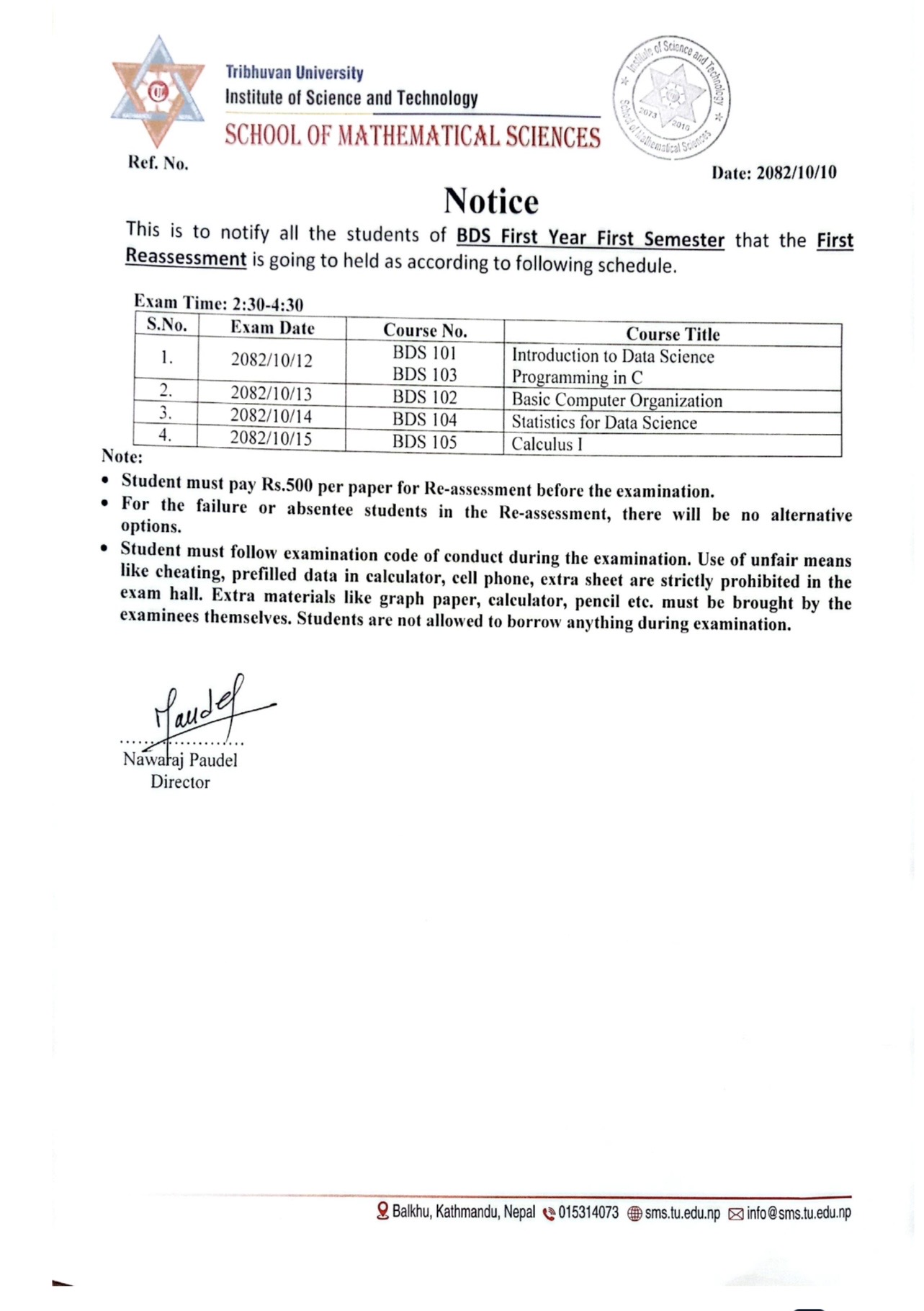 BDS First Year First Semester First Reassessment Exam Schedule 2082