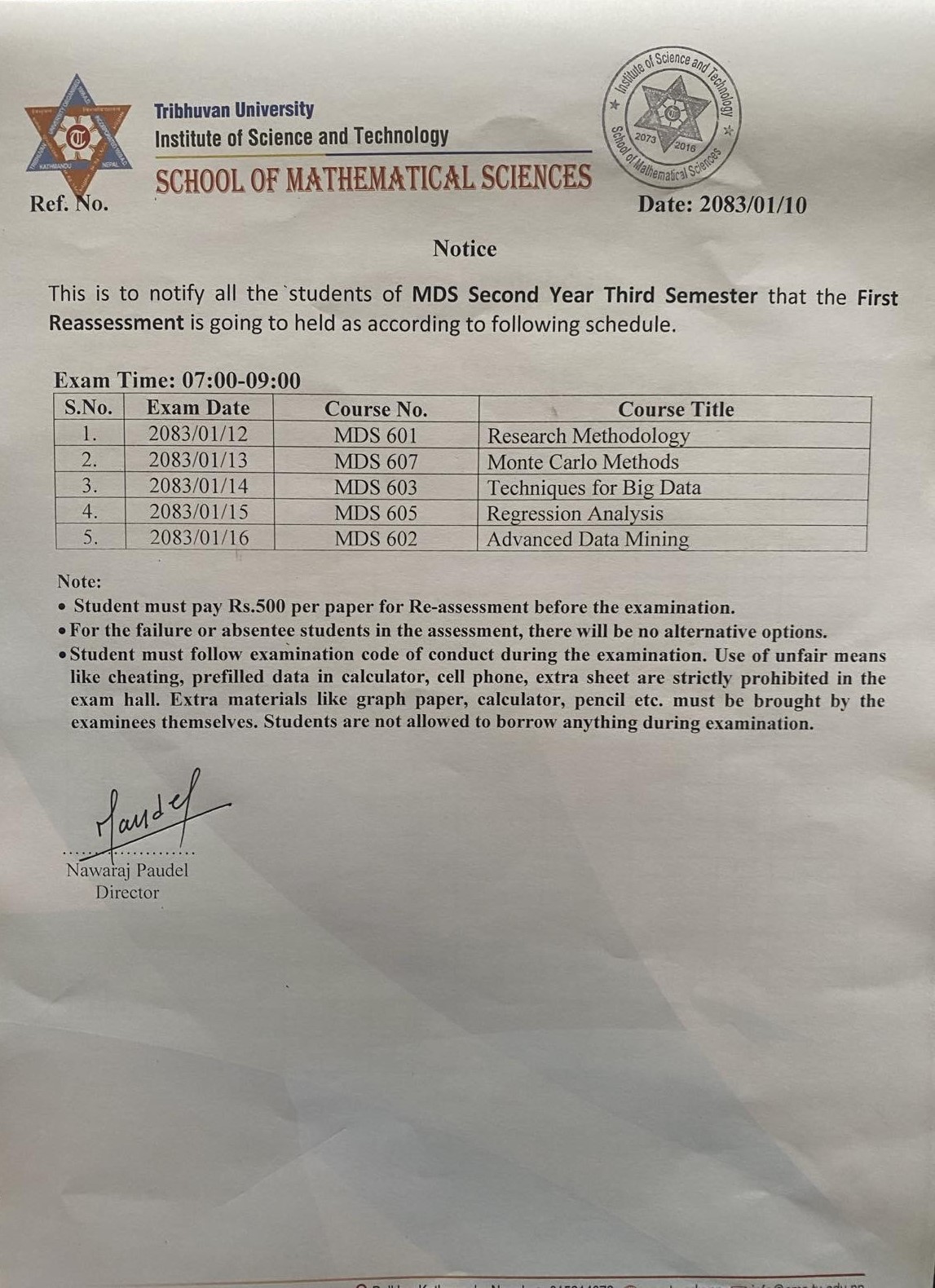 MDS Third Semester First Reassessment Exam Schedule 2083