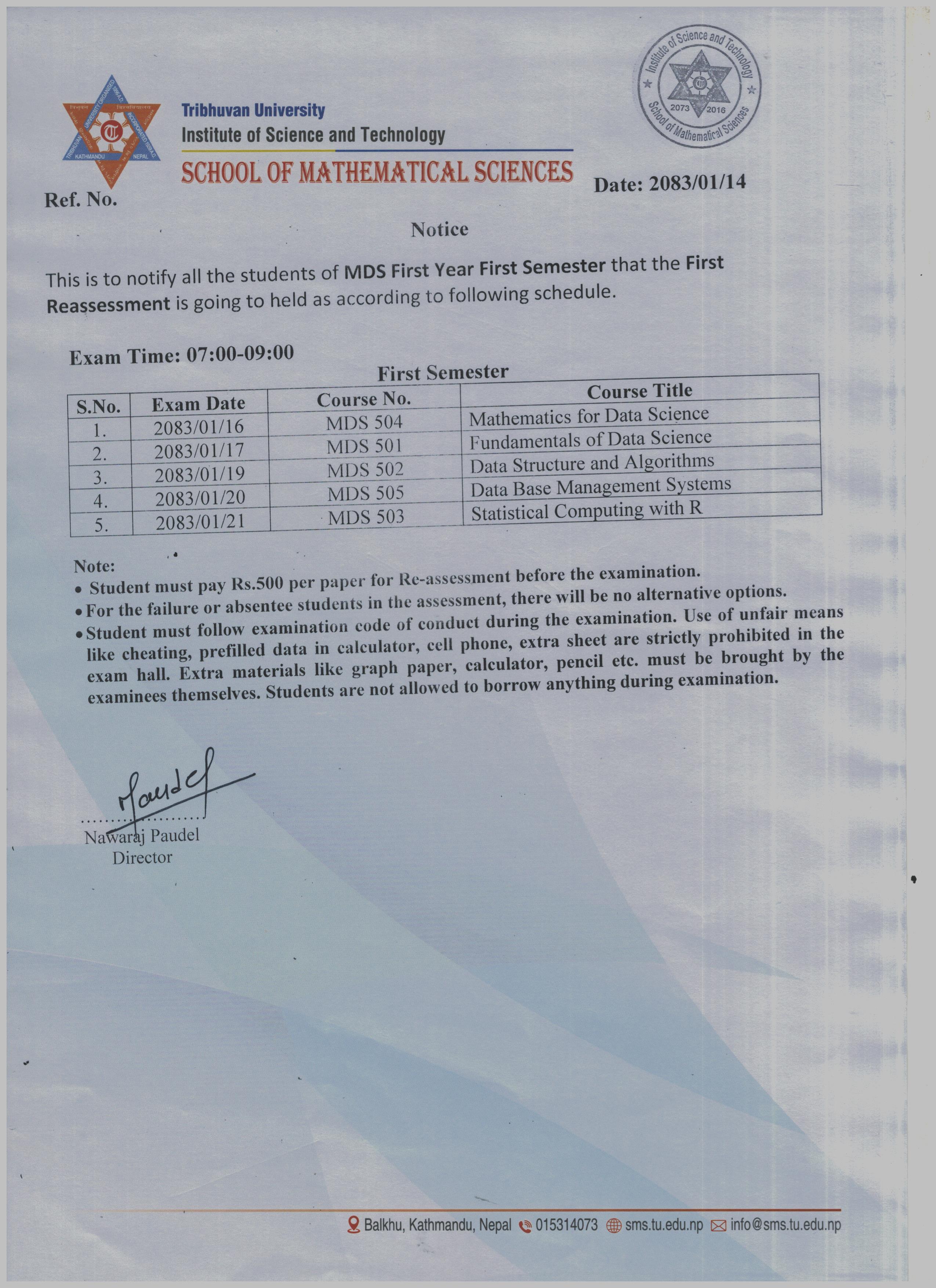 MDS First Semester First Reassessment Exam Schedule 2083