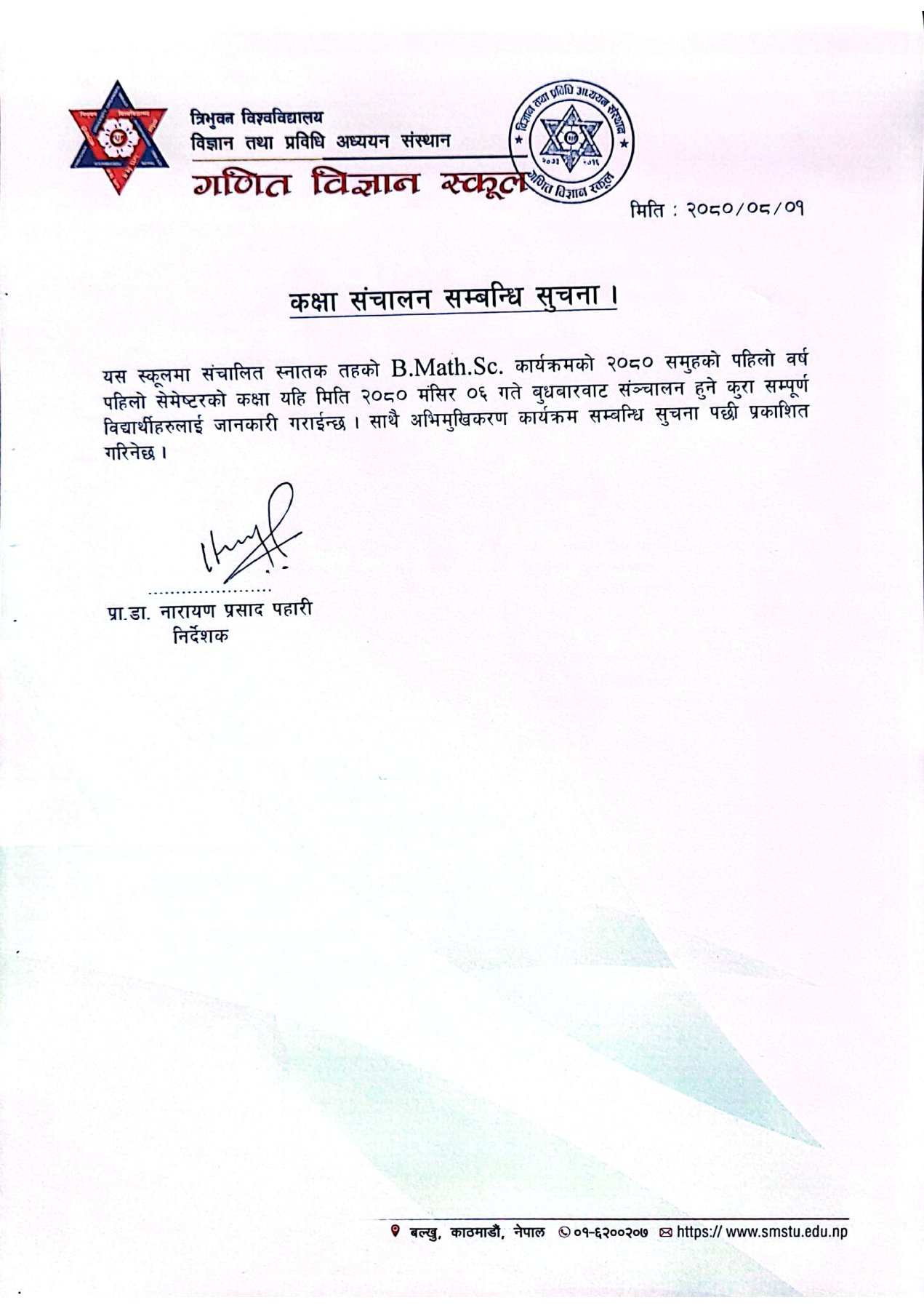 यस स्कूलमा संचालित स्नातक तहको B. Math.Sc. कार्यक्रमको २०८० समुहको पहिलो वर्ष पहिलो सेमेष्टरको कक्षा यहि मिति २०८० मंसिर ०६ गते बुधवारवाट सञ्चालन हुने कुरा सम्पूर्ण विद्यार्थीहरुलाई जानकारी गराईन्छ। साथै अभिमुखिकरण कार्यक्रम सम्बन्धि सुचना पछी प्रकाशित गरिनेछ ।