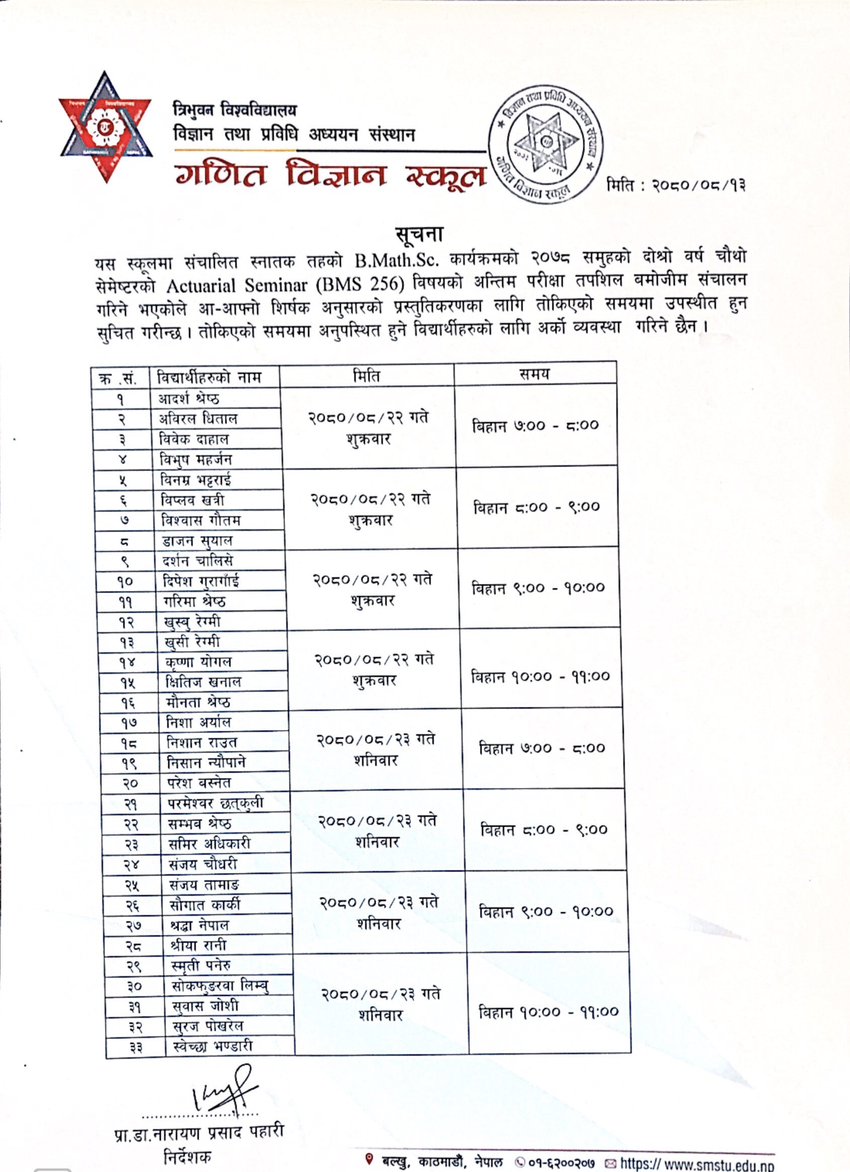 Actuarial seminar exam schedule of B.Math.Sc second year fourth semester 2080