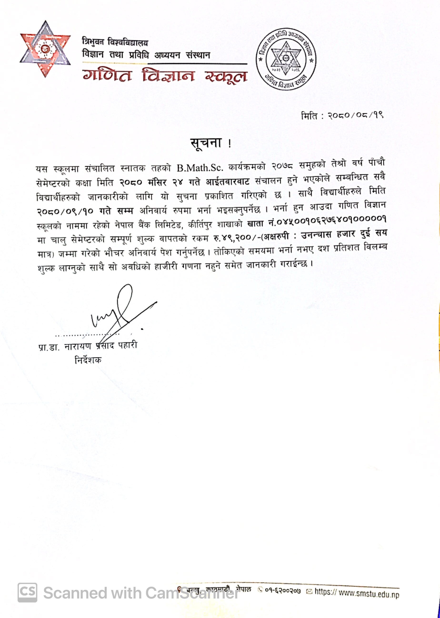 स्नातक तहको B.Math.Sc कार्यक्रम २०७८ समुहको तेस्रो वर्ष पाँचौ सेमेष्टरको कक्षा संचालन सम्बन्धी सुचना २०८०
