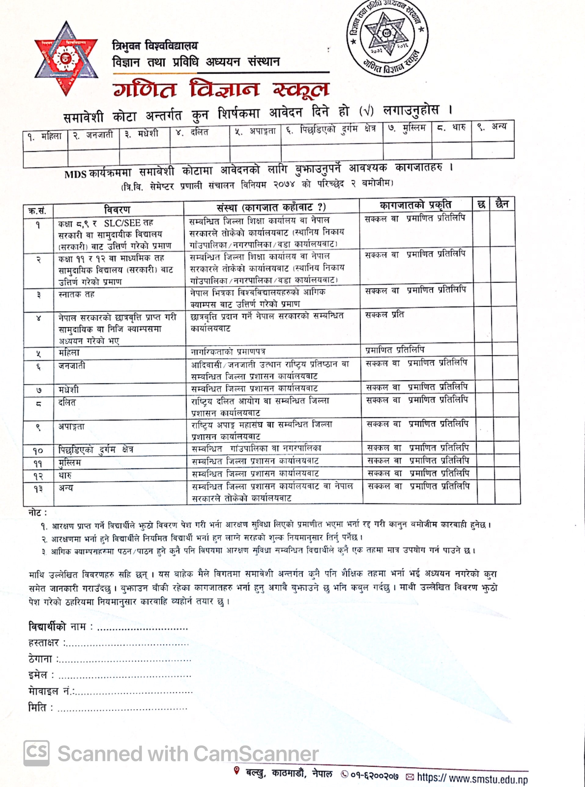 समाबेशी कोटाको आवेदन फाराम
