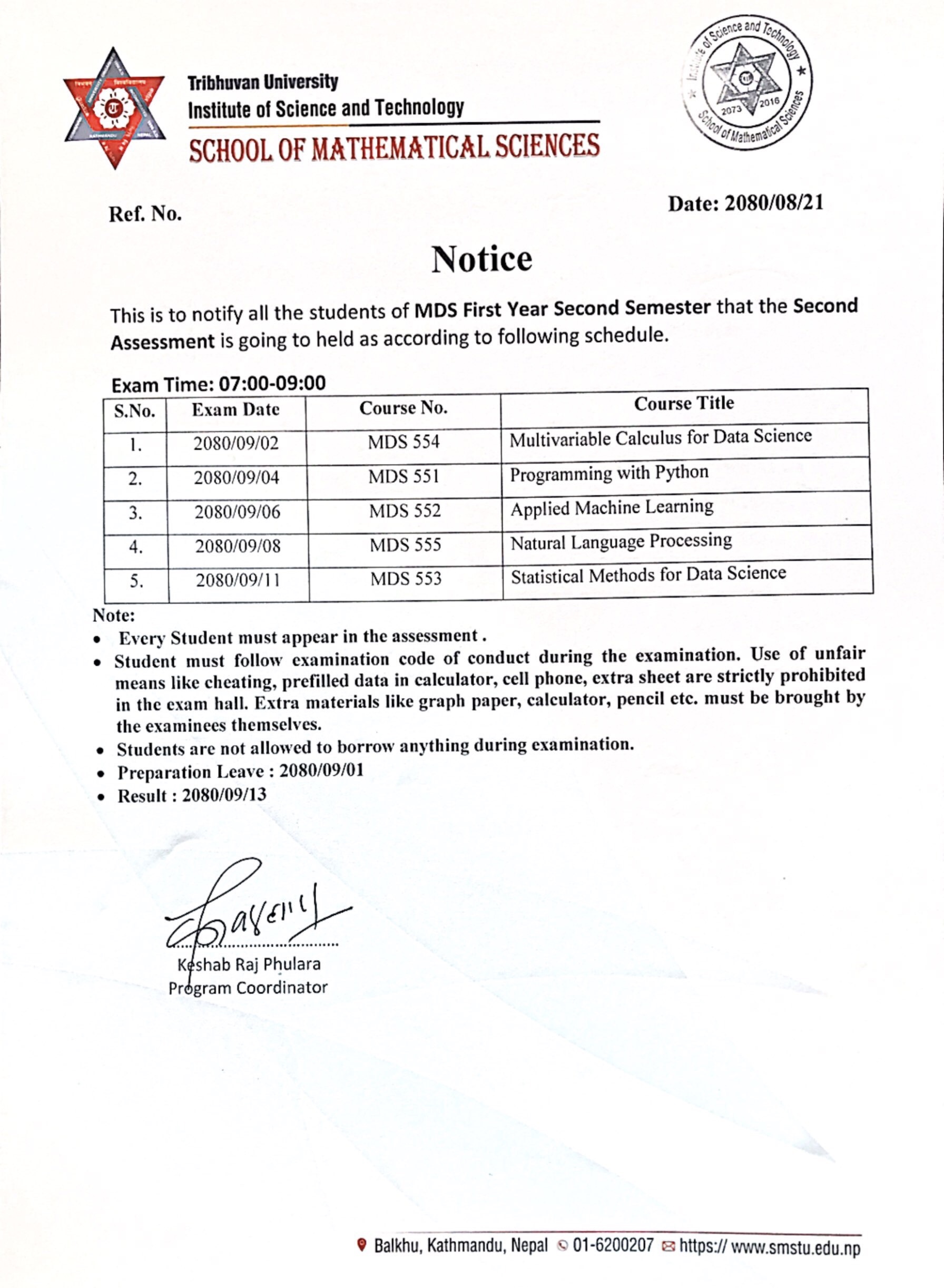 MDS First Year Second Semester Second Assessment schedule 2080