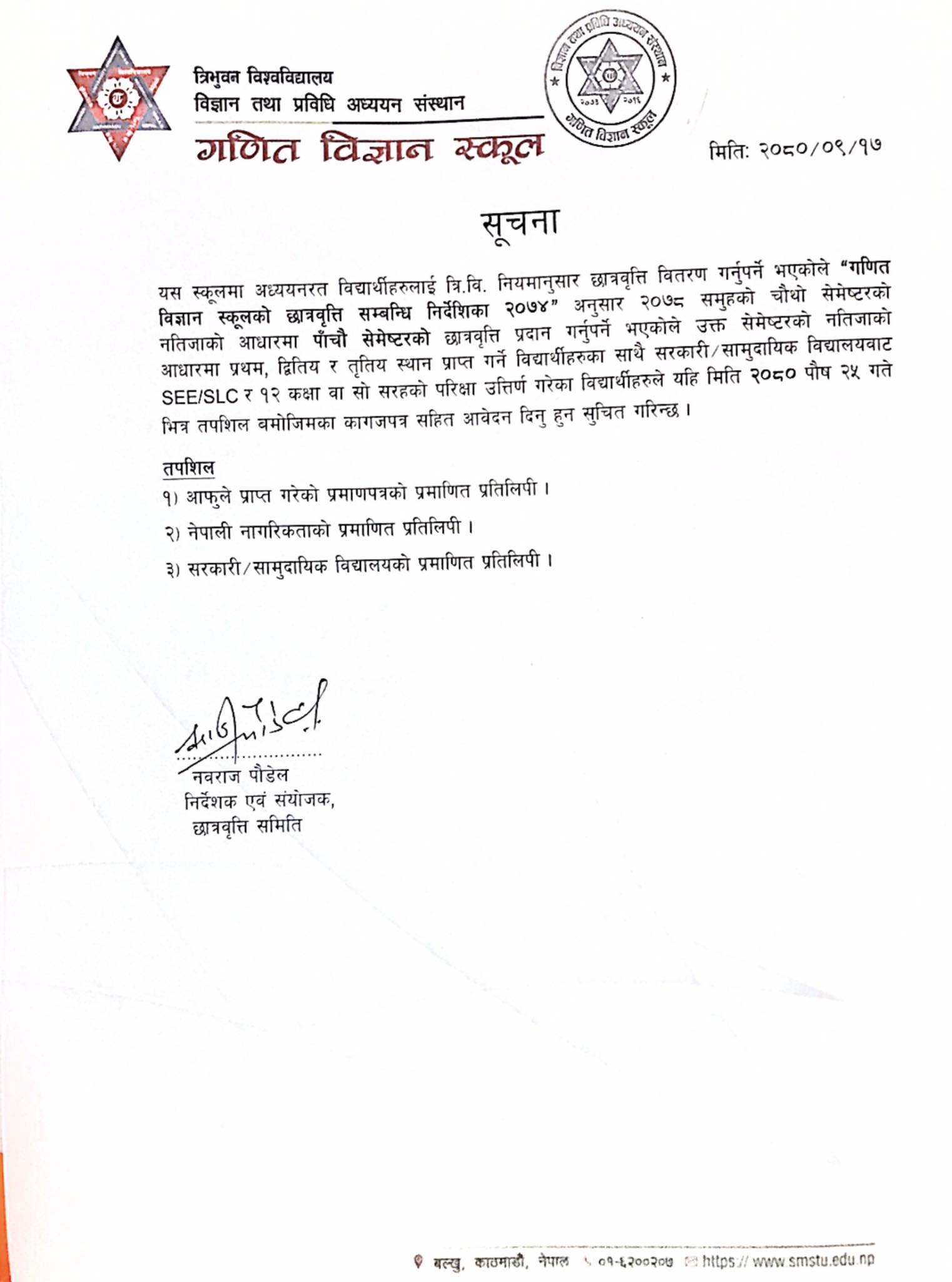 B.Math.Sc २०७८ समुहको छात्रवृति सम्बन्धि सुचना २०८०