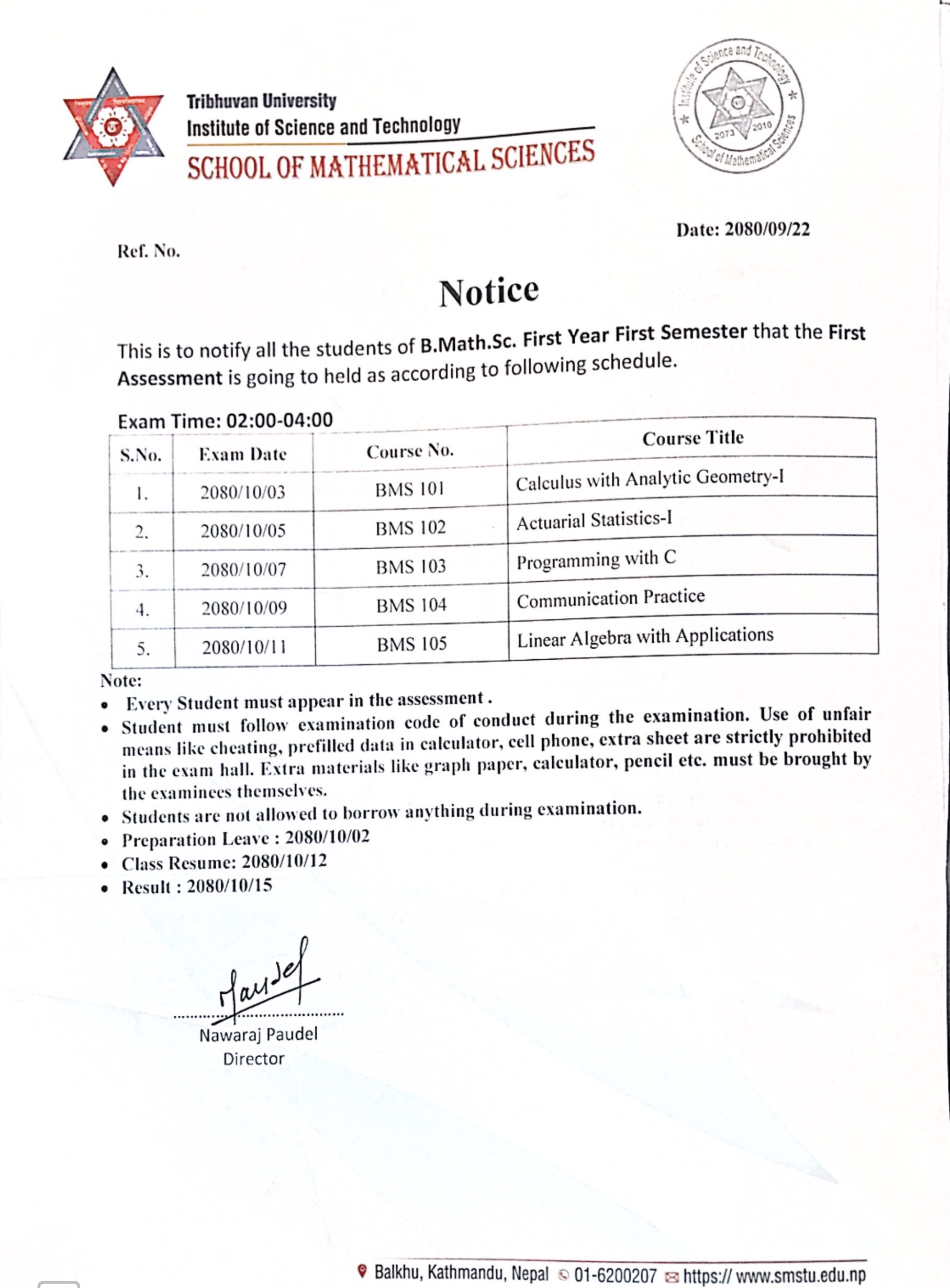 B.Math.Sc First Year First Semester First Assessment Routine 2080