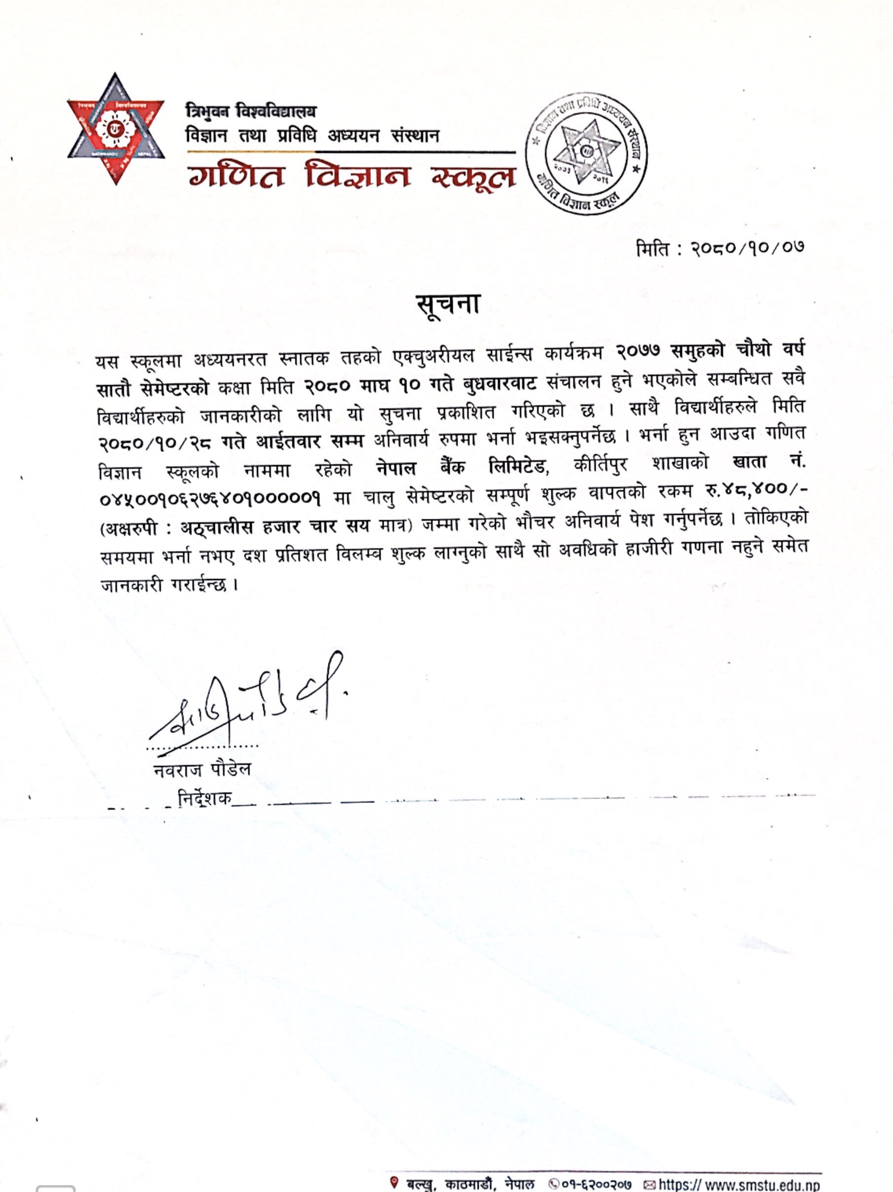 स्नातक तहको B.Math.Sc कार्यक्रम २०७७ समुहको चौथो बर्ष सातौ सेमेष्टरको कक्षा संचालन सम्बन्धी सुचना २०८०