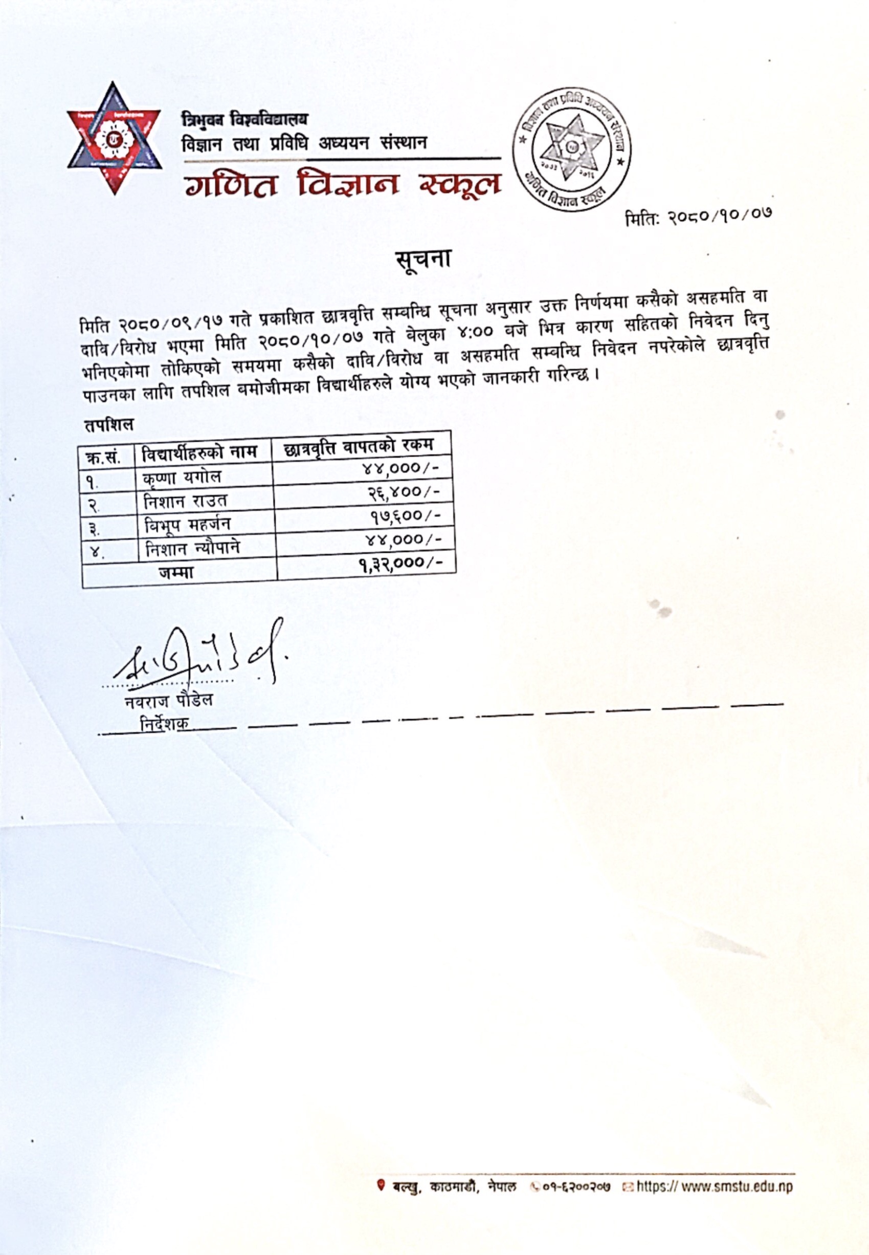 B.Math.Sc २०७८ समुहको छात्रवृति सम्बन्धि सुचना २०८०
