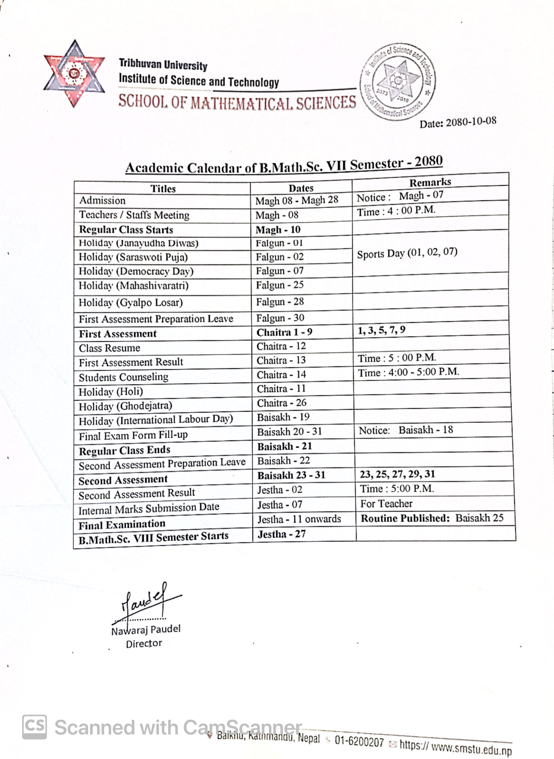 Academic Calendar of B.Math.Sc Seventh Semester 2080
