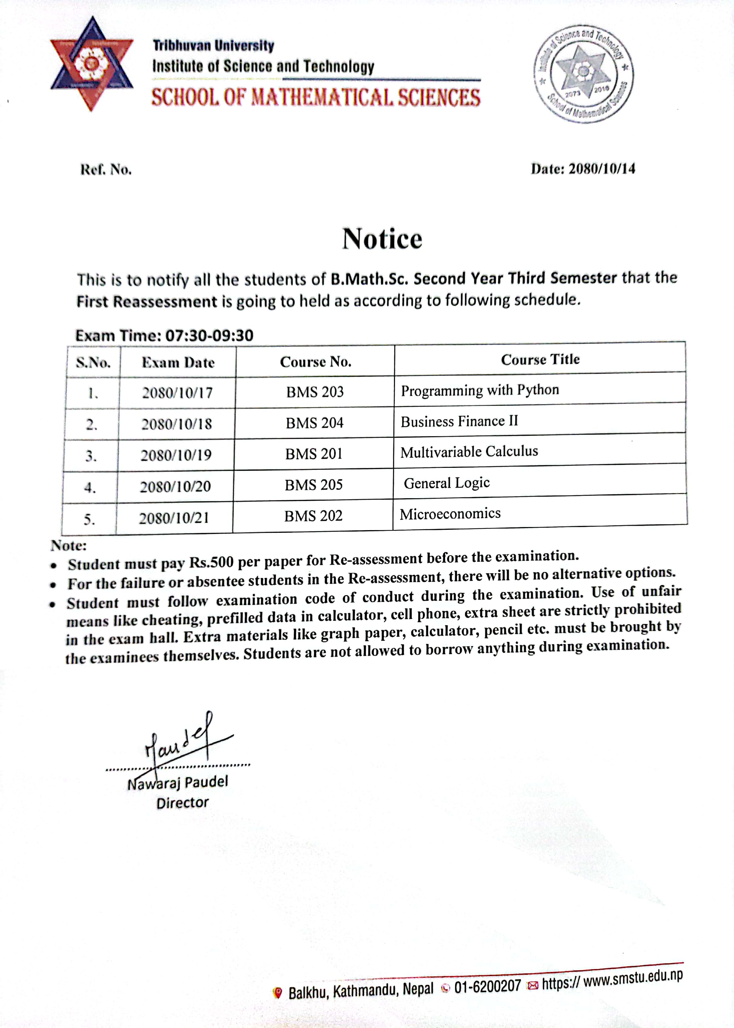 B.Math.Sc 2079 Batch Third Semester First Reassessment Exam Schedule 2080