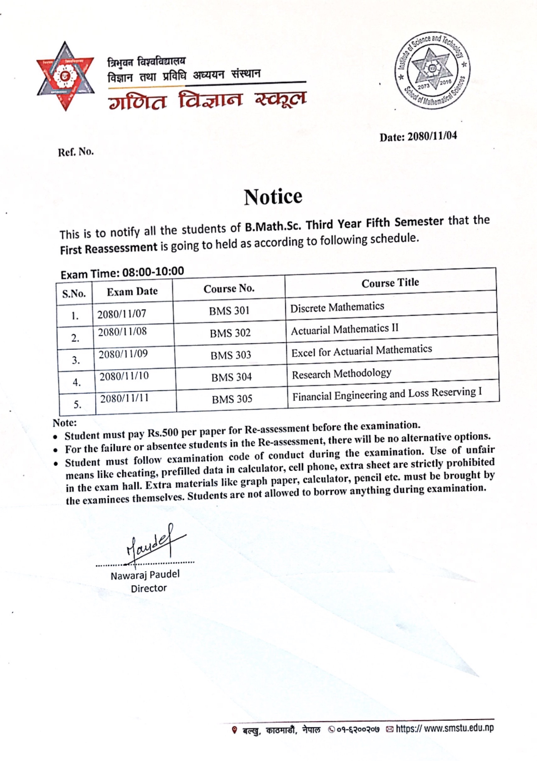 BMS Third Year Fifth Semester First Reassesssment Exam Schedule 2080