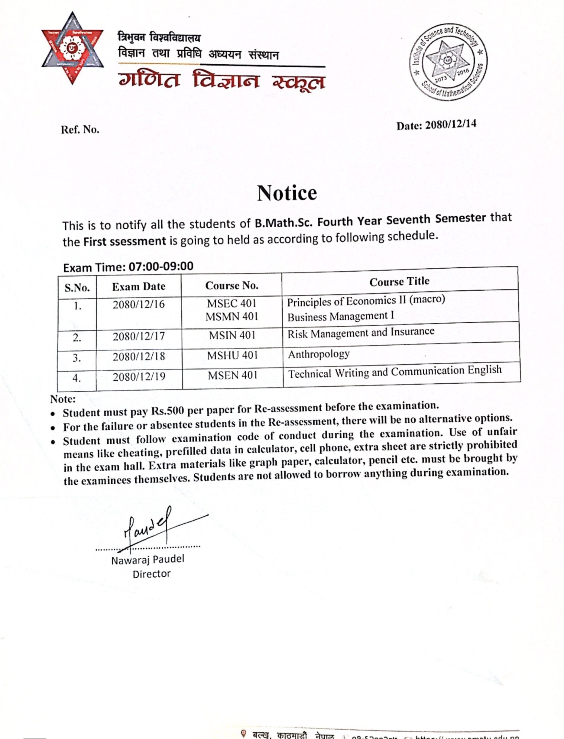 B.Math.Sc Fourth Year Seventh Semester First Reassessment Exam Schedule 2080