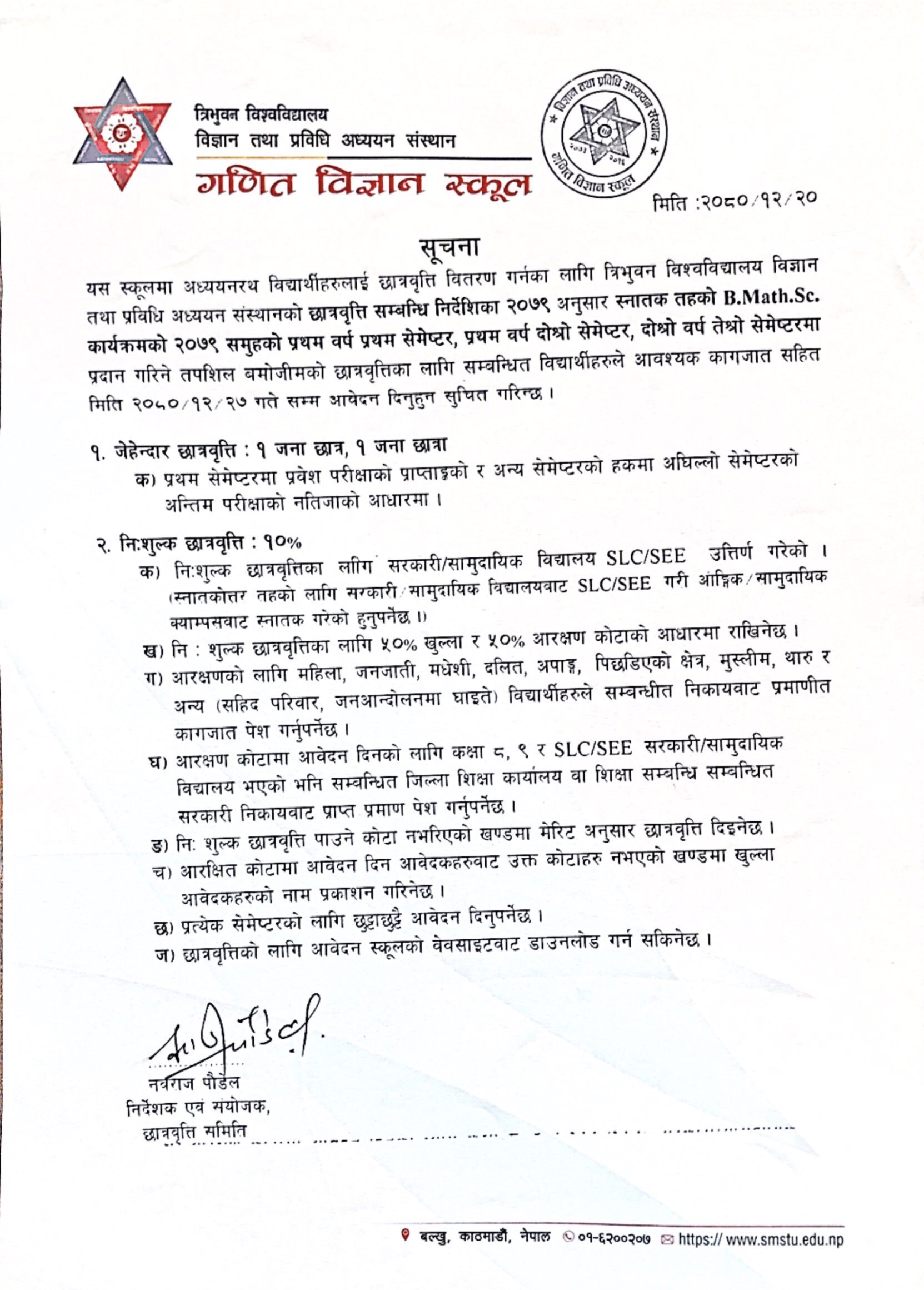 B.Math.Sc २०७९ समुहको छात्रवृति सम्बन्धि सुचना २०८०