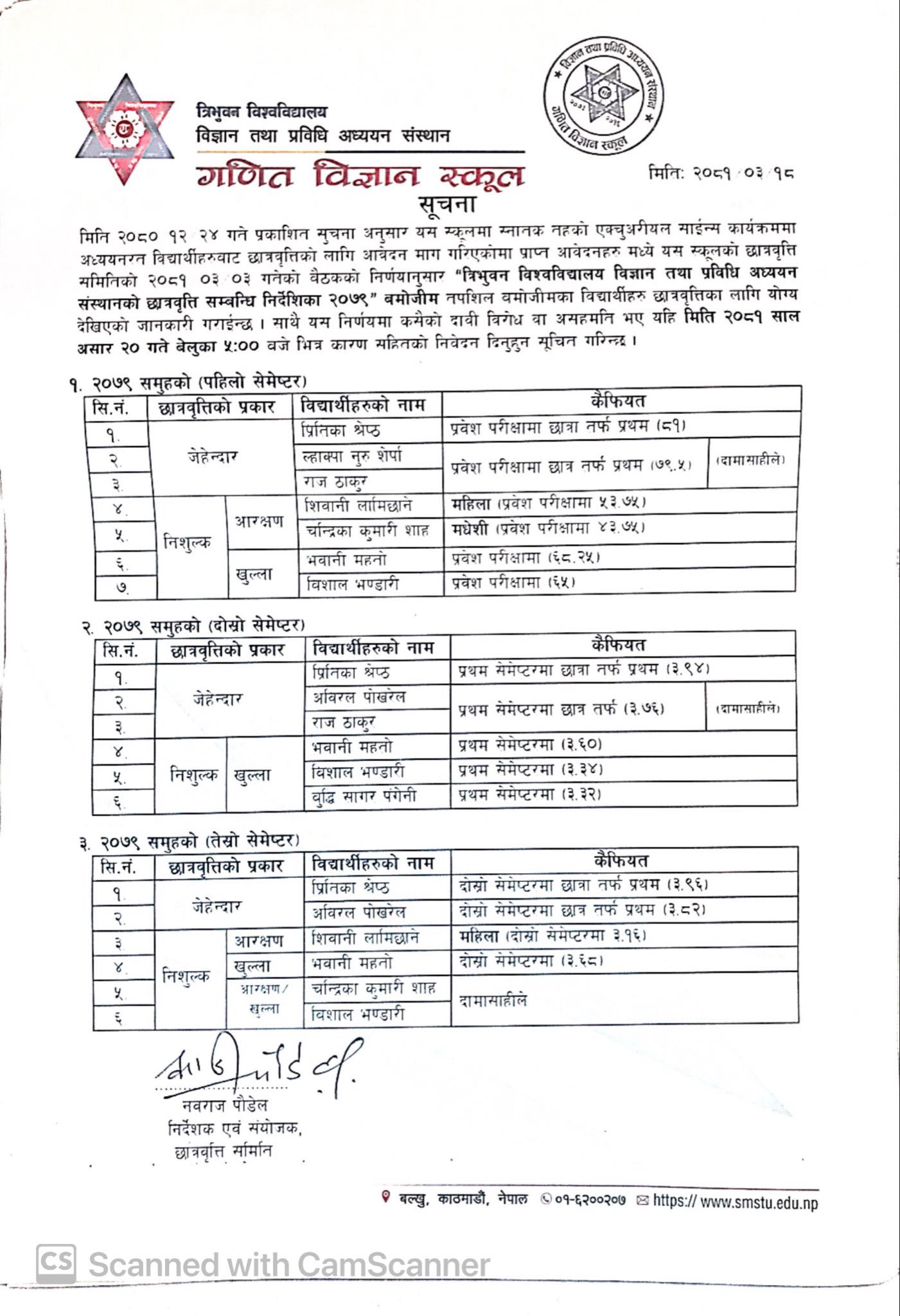 B.Math.Sc २०७९ समुहको छात्रवृति सम्बन्धि सुचना २०८१