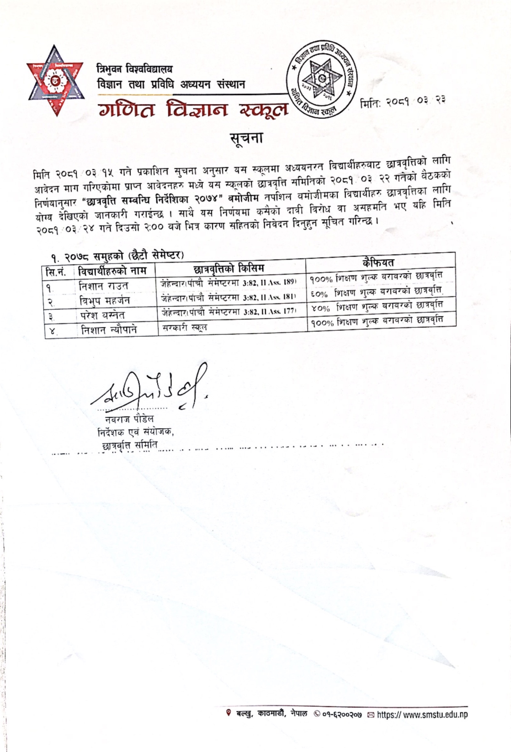 B.Math.Sc २०७८ समुहको छात्रवृति सम्बन्धि सुचना २०८१