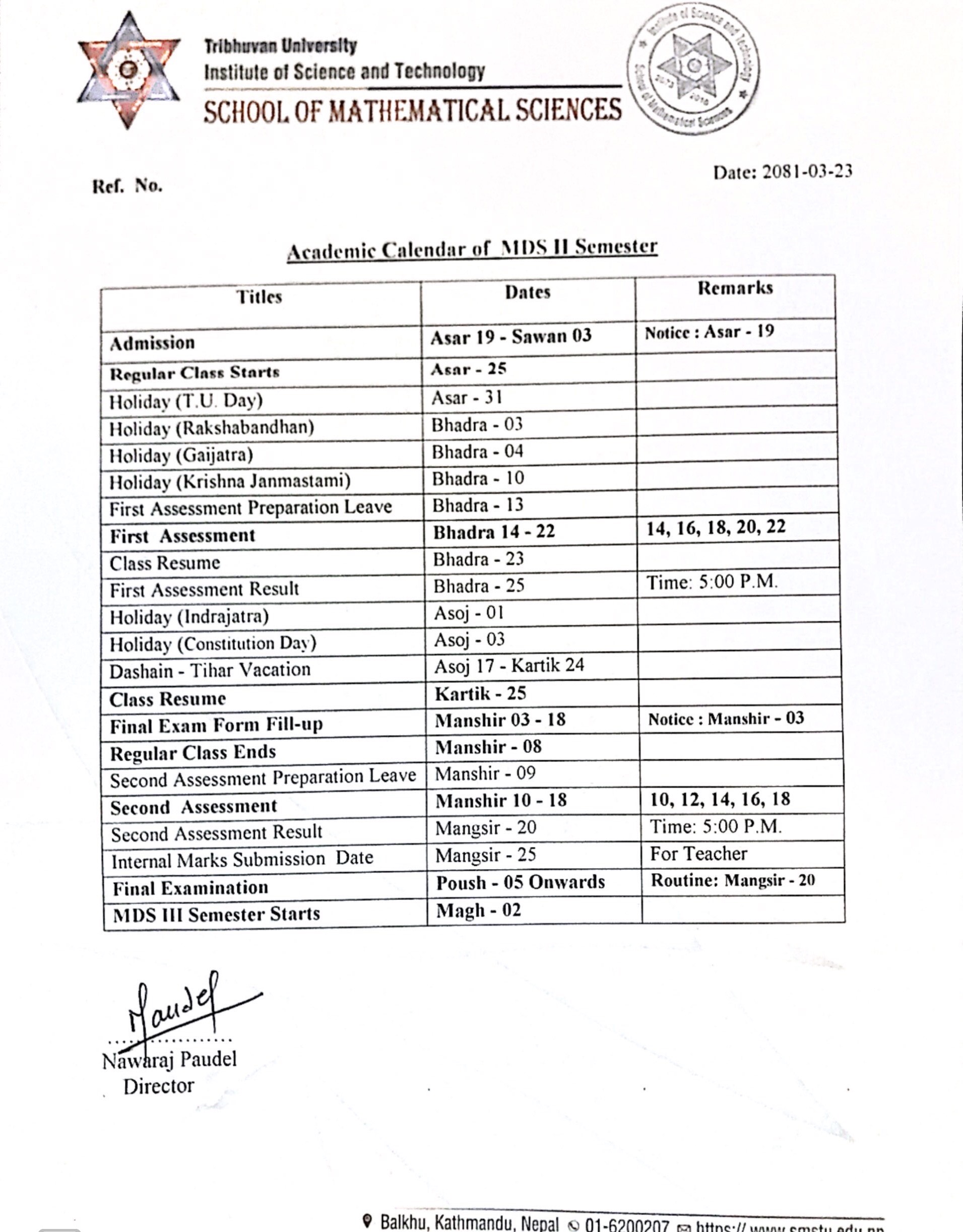 Academic calendar of MDS I Year II Semester 2081