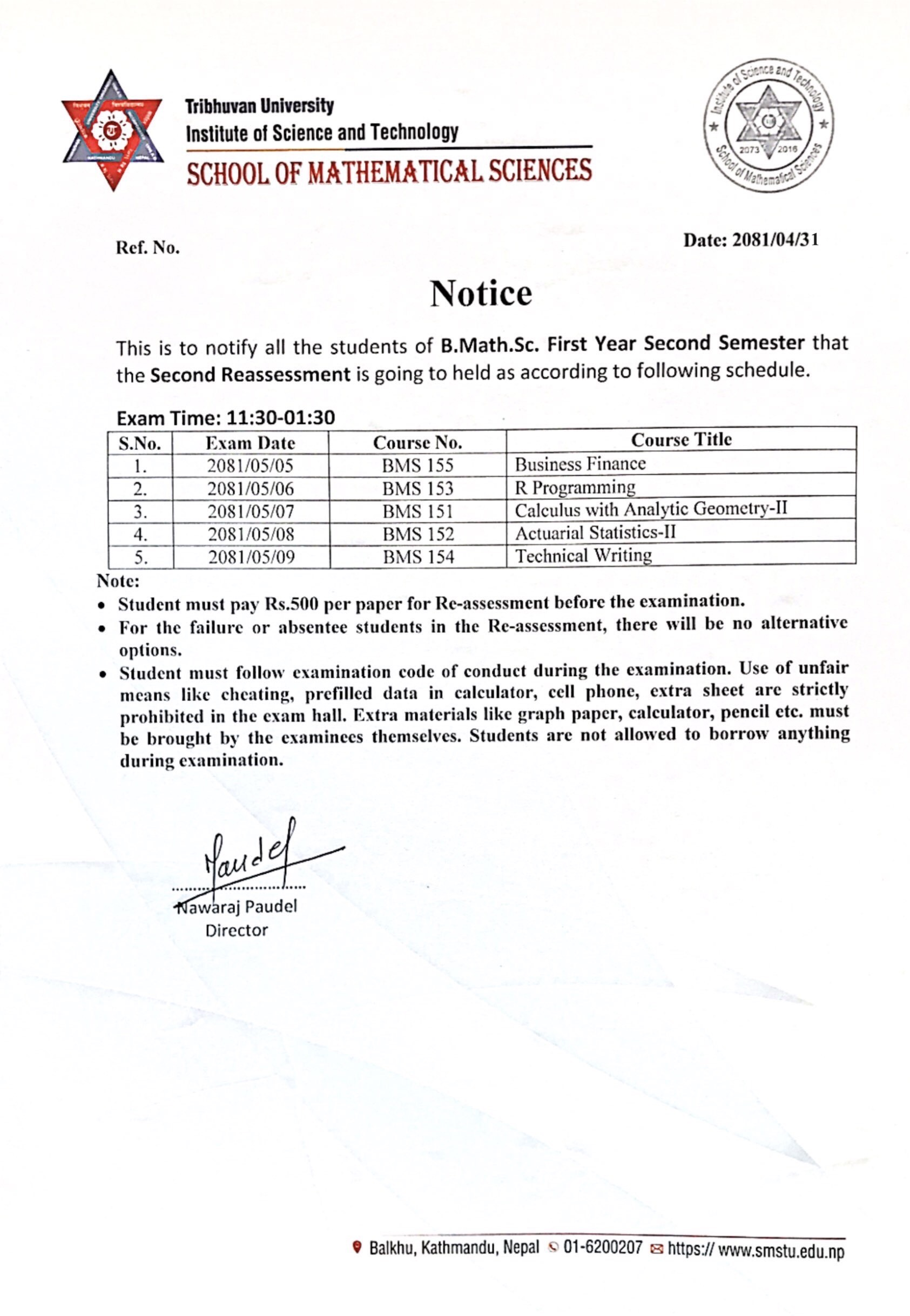 B.Math.Sc First Year Second Semester Second Reassessment Exam Schedule 2081