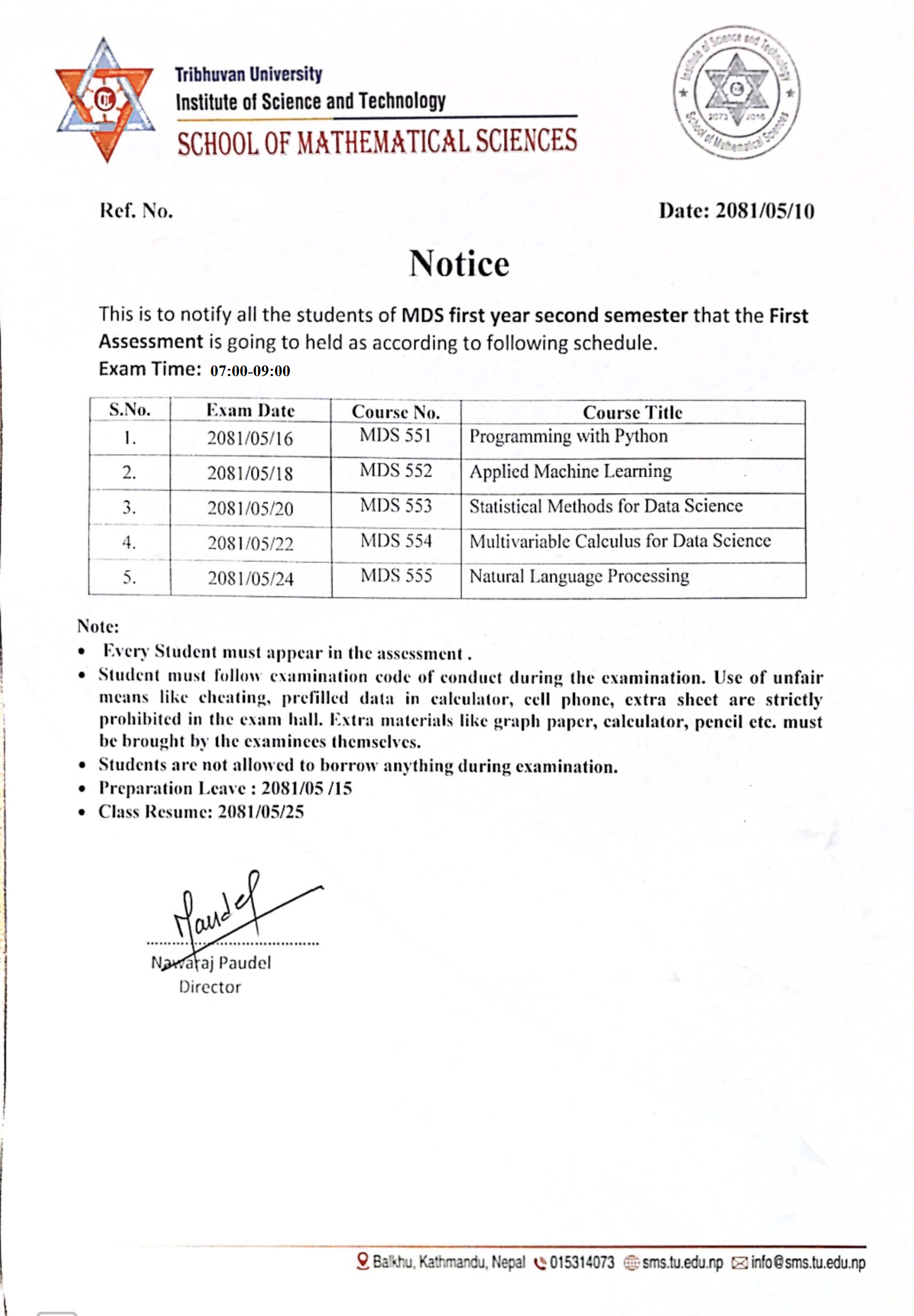 MDS First Year Second Semester First Assessment Exam Schedule 2081