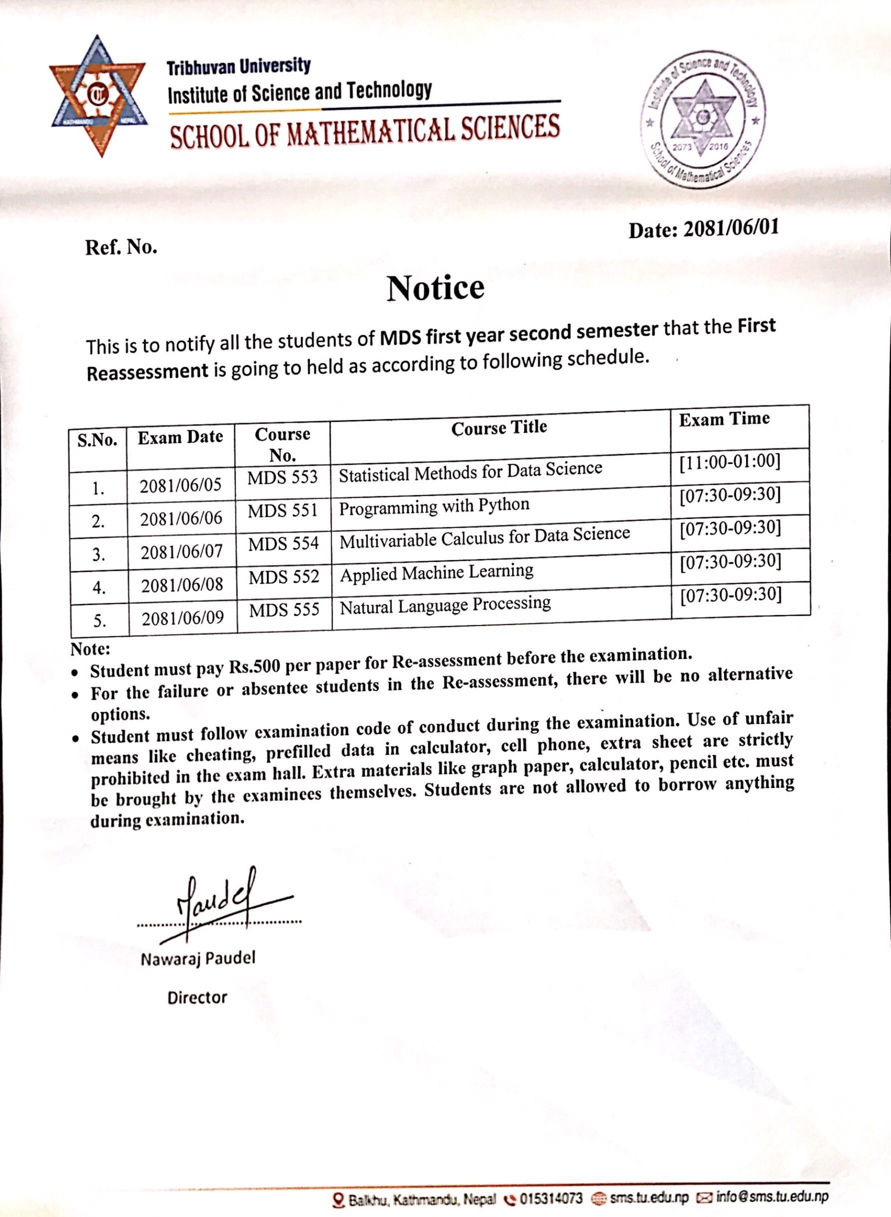 MDS First Year Second Semester First Reassessment Exam Schedule 2081