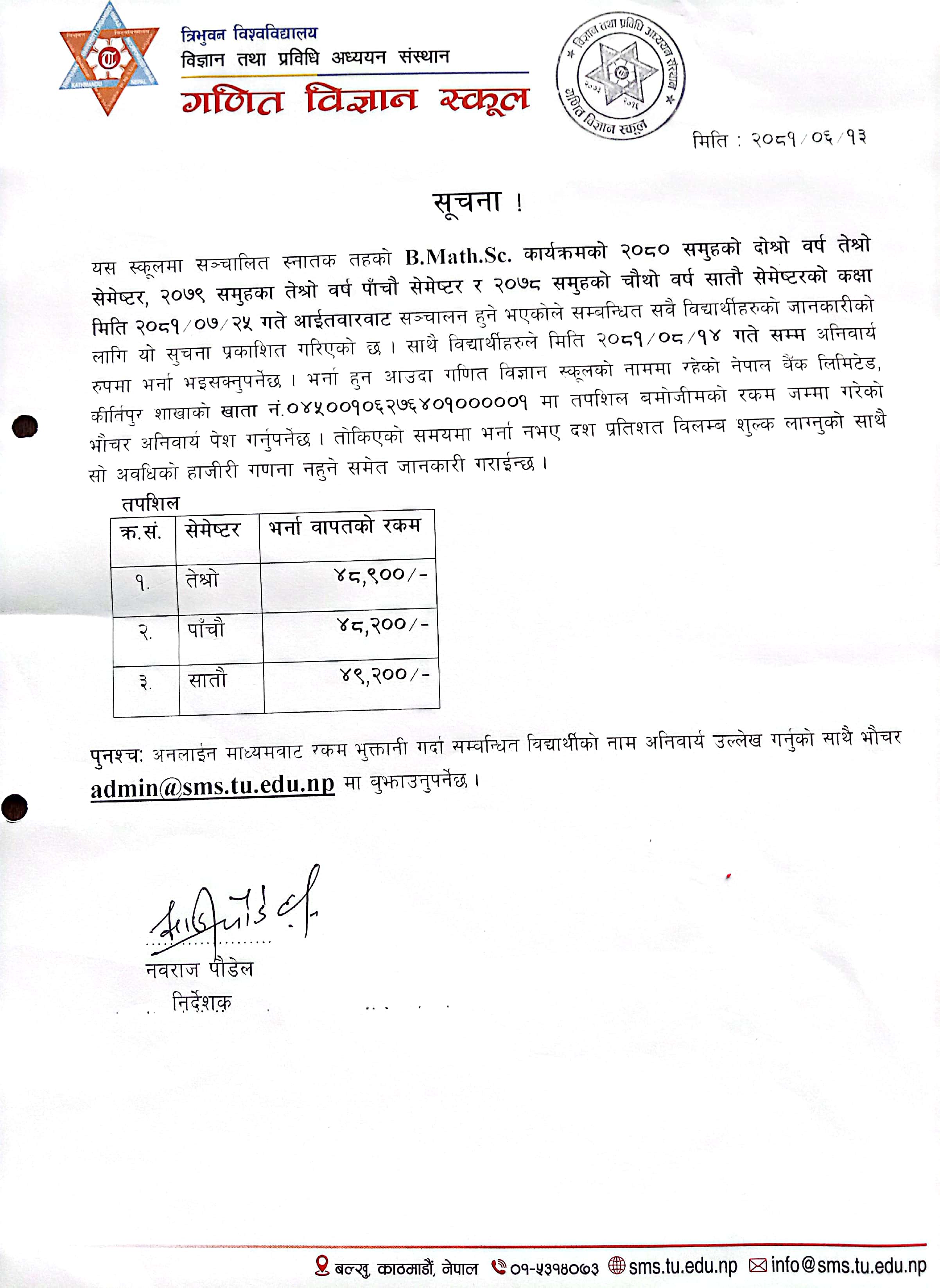 B.Math.Sc 2080 समुह तेश्रो सेमेष्टर, 2079 समुह पाचौ सेमेष्टर, 2078 समुह सातौ सेमेष्टरको कक्षा सञ्चालन तथा भर्ना सम्बन्धि सुचना २०८१