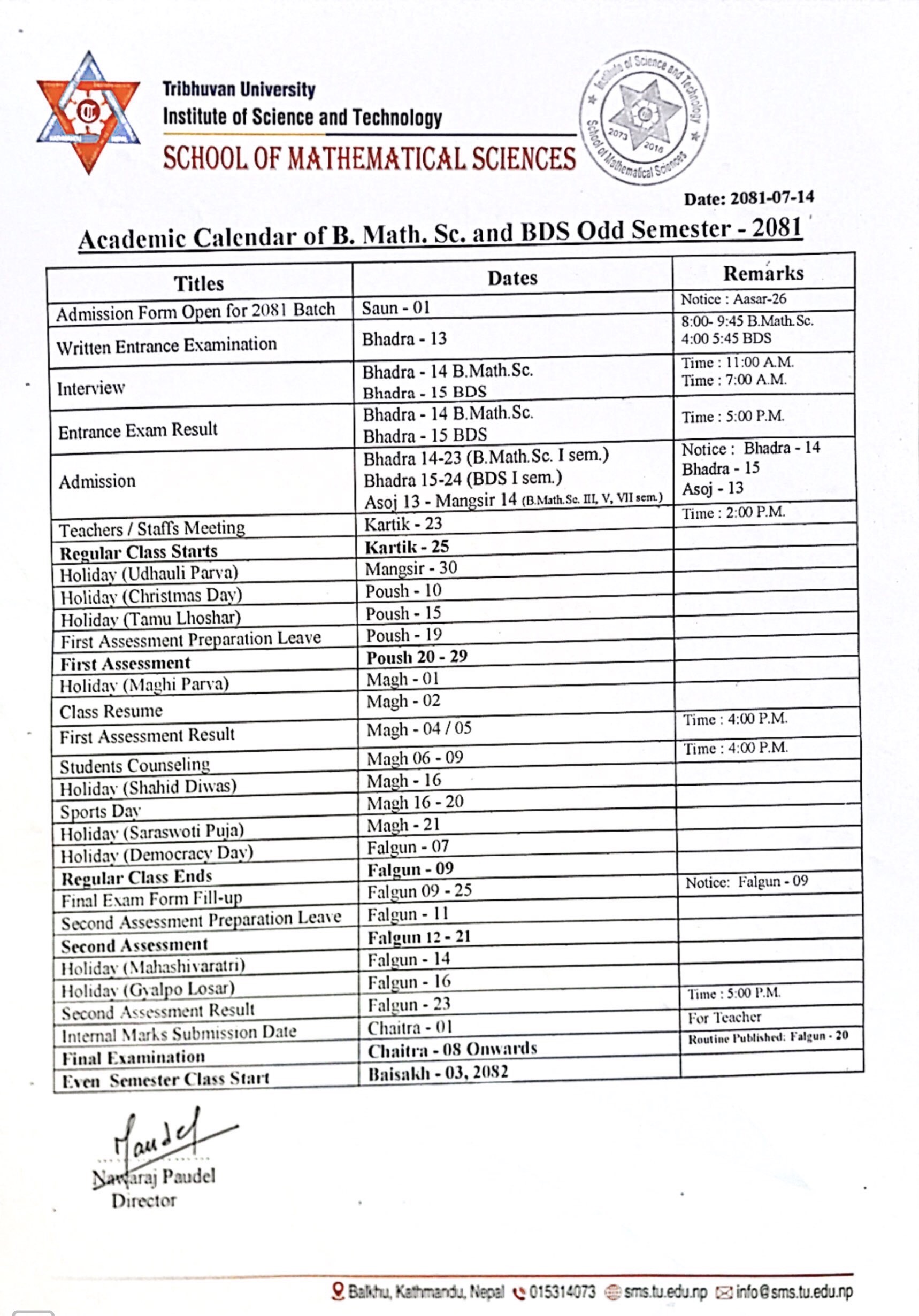 Academic Calendar of B.Math.Sc. and BDS Odd Semester 2081