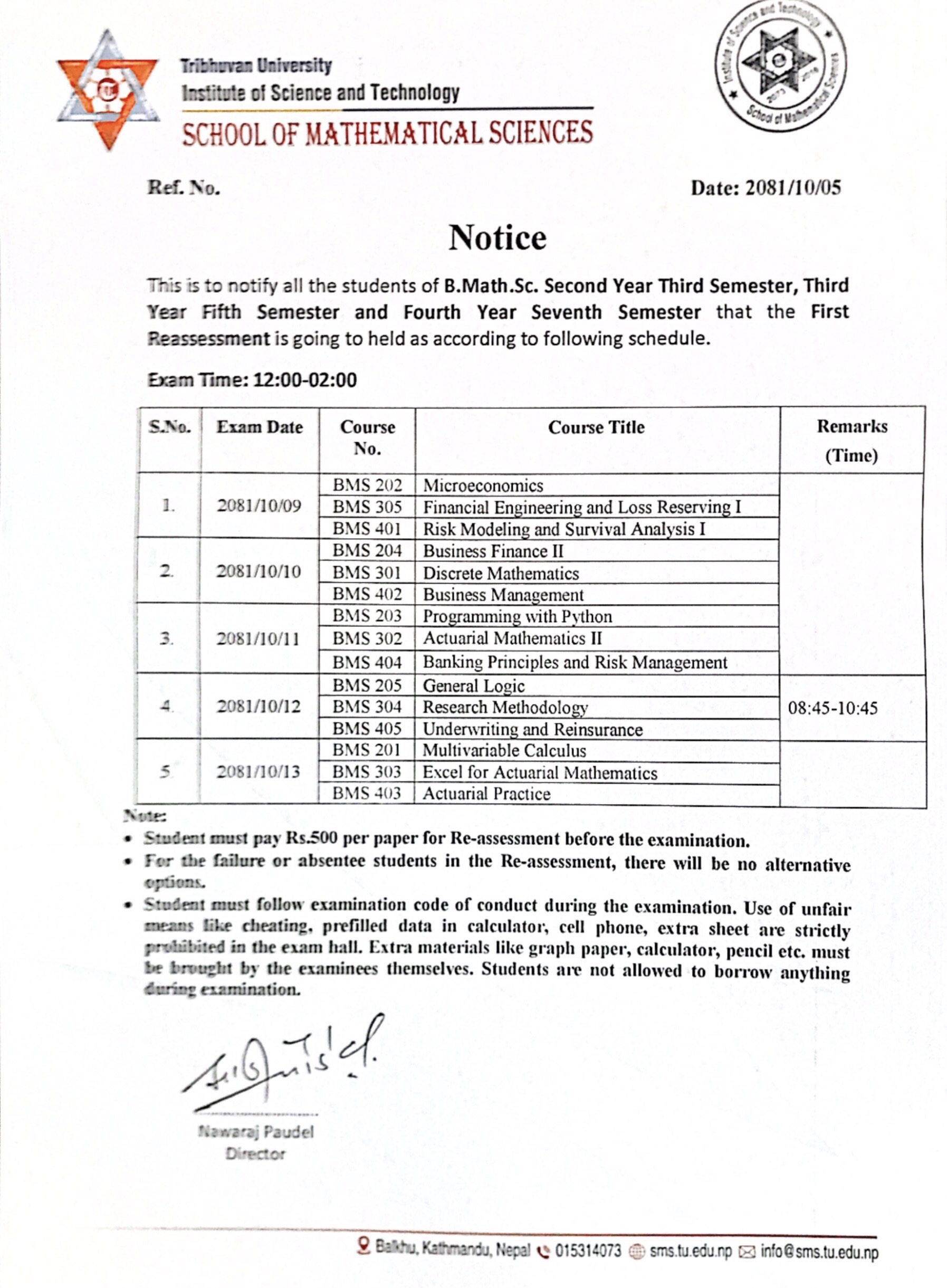 B.Math.Sc. Second Year Third Semester, Third Year Fifth Semester and Fourth Year Seventh Semester First Reassessment Exam Schedule 2081