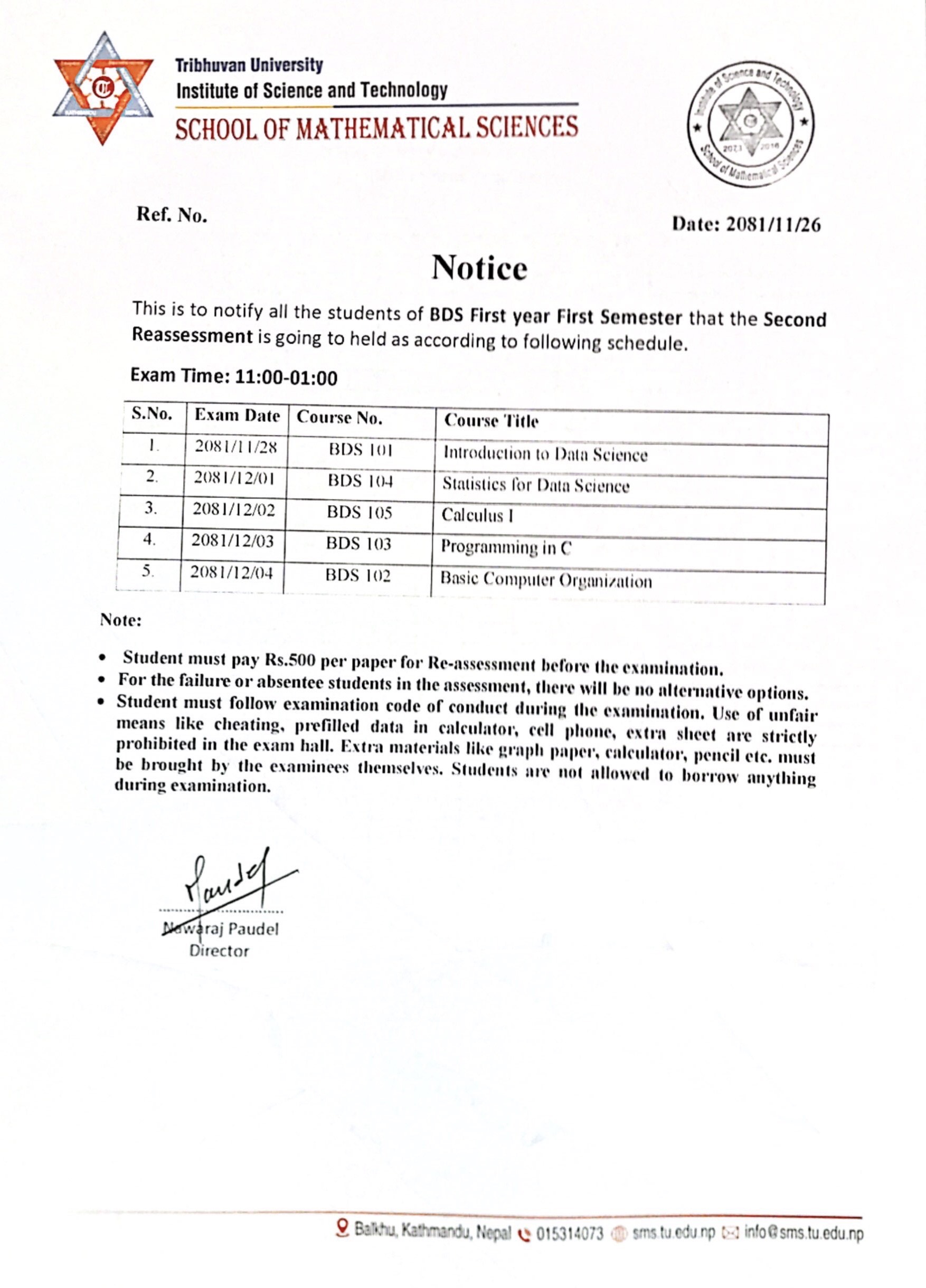 BDS First Year First Semester Second Reassessment Exam Schedule 2081