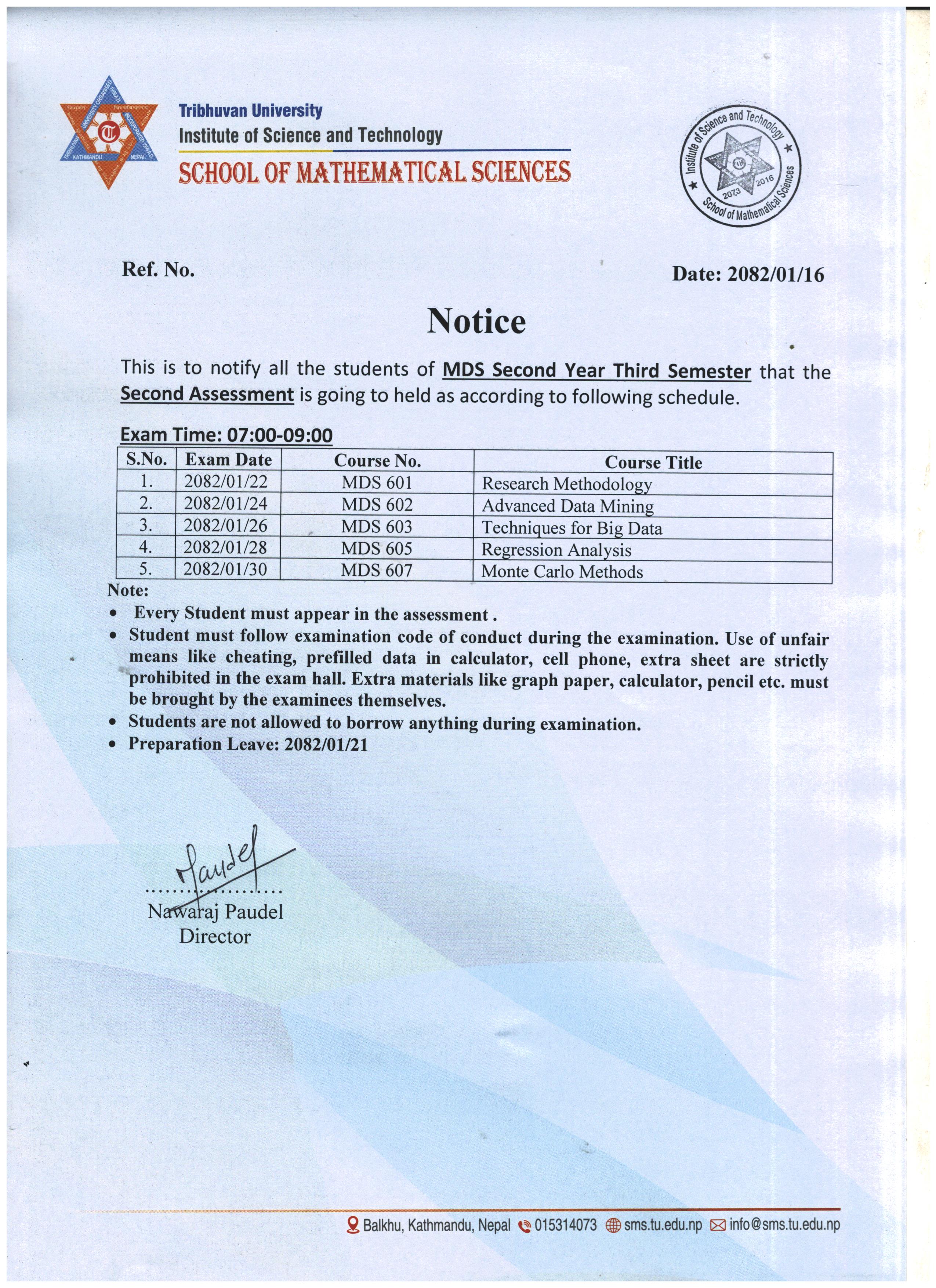 MDS Second Year Third Semester Second Assessment Exam Schedule 2082