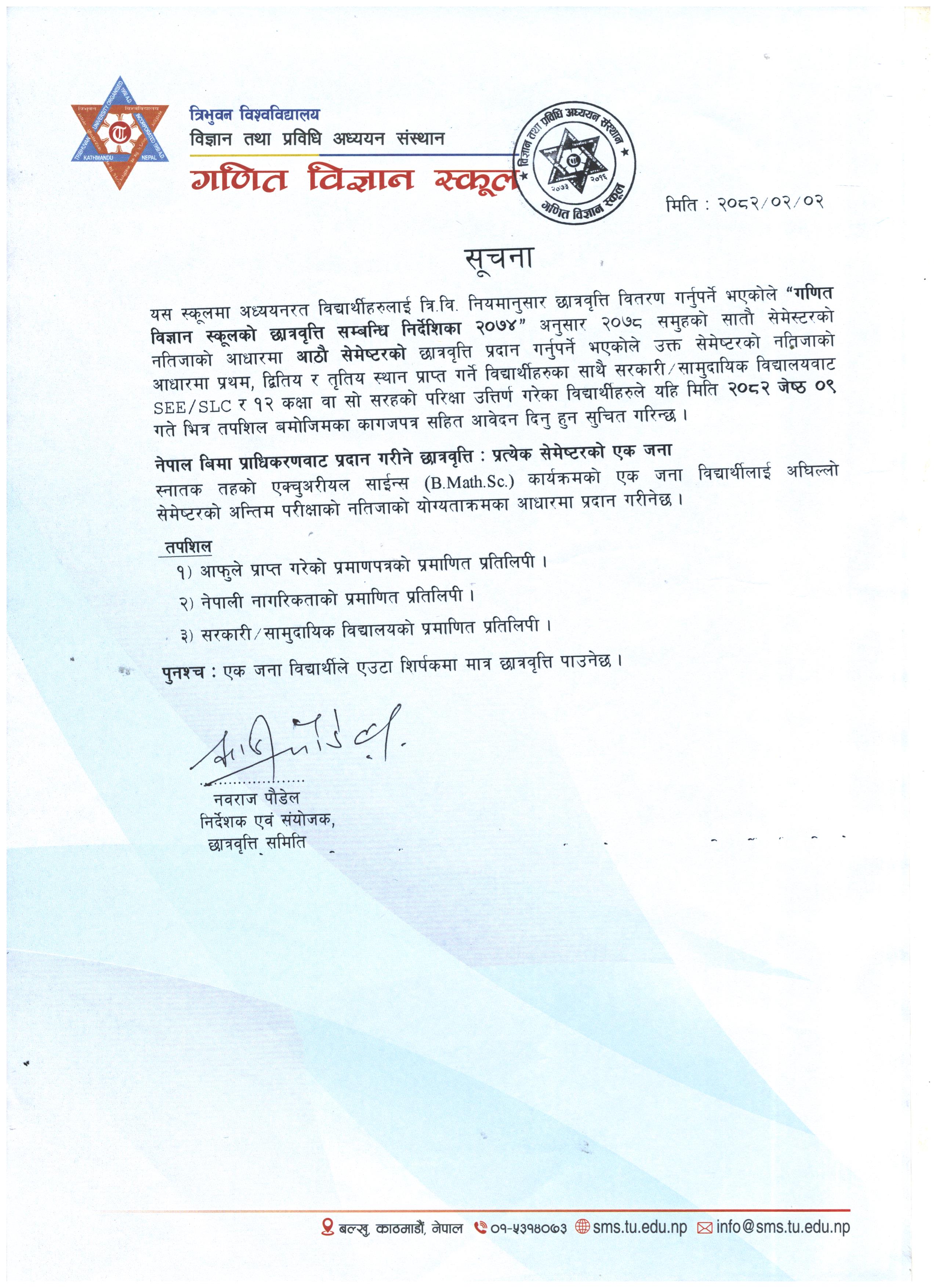 स्नातक तह एक्चुअरियल साईन्स २०७८ समुह आठौ सेमेष्टरको छात्रवृत्ति सम्बन्धि सुचना २०८२