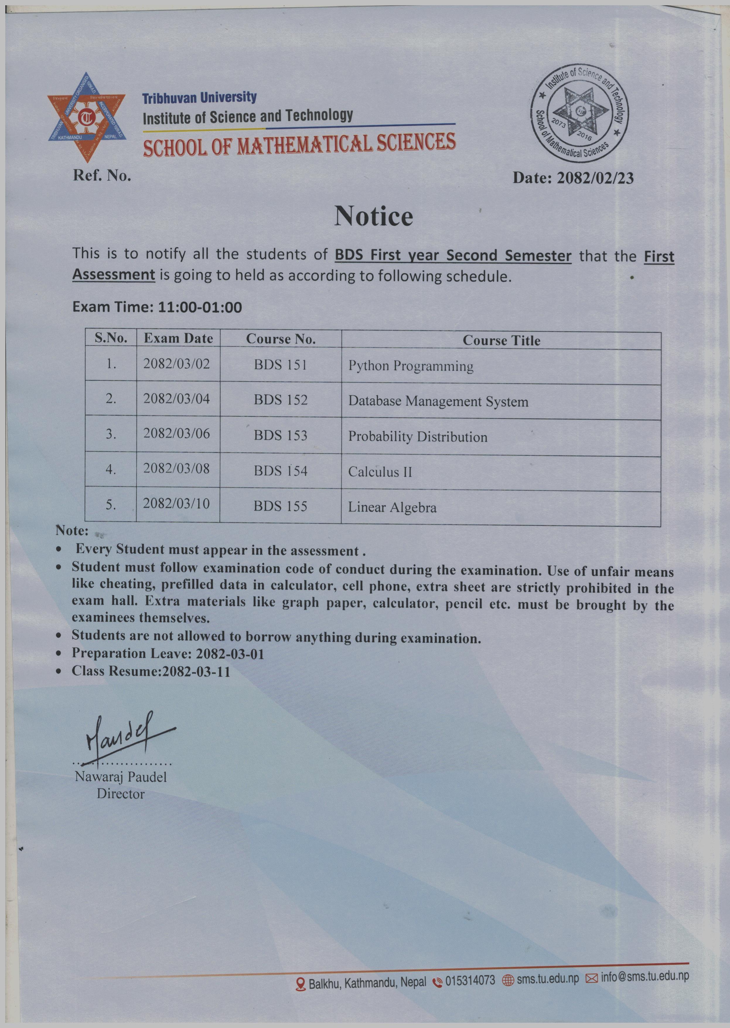 B.Math.Sc. First Year First Semester, Second Year Third Semester, Third Year Fifth Semester and Fourth Year Seventh Semester Second Assessment Exam Schedule 2082