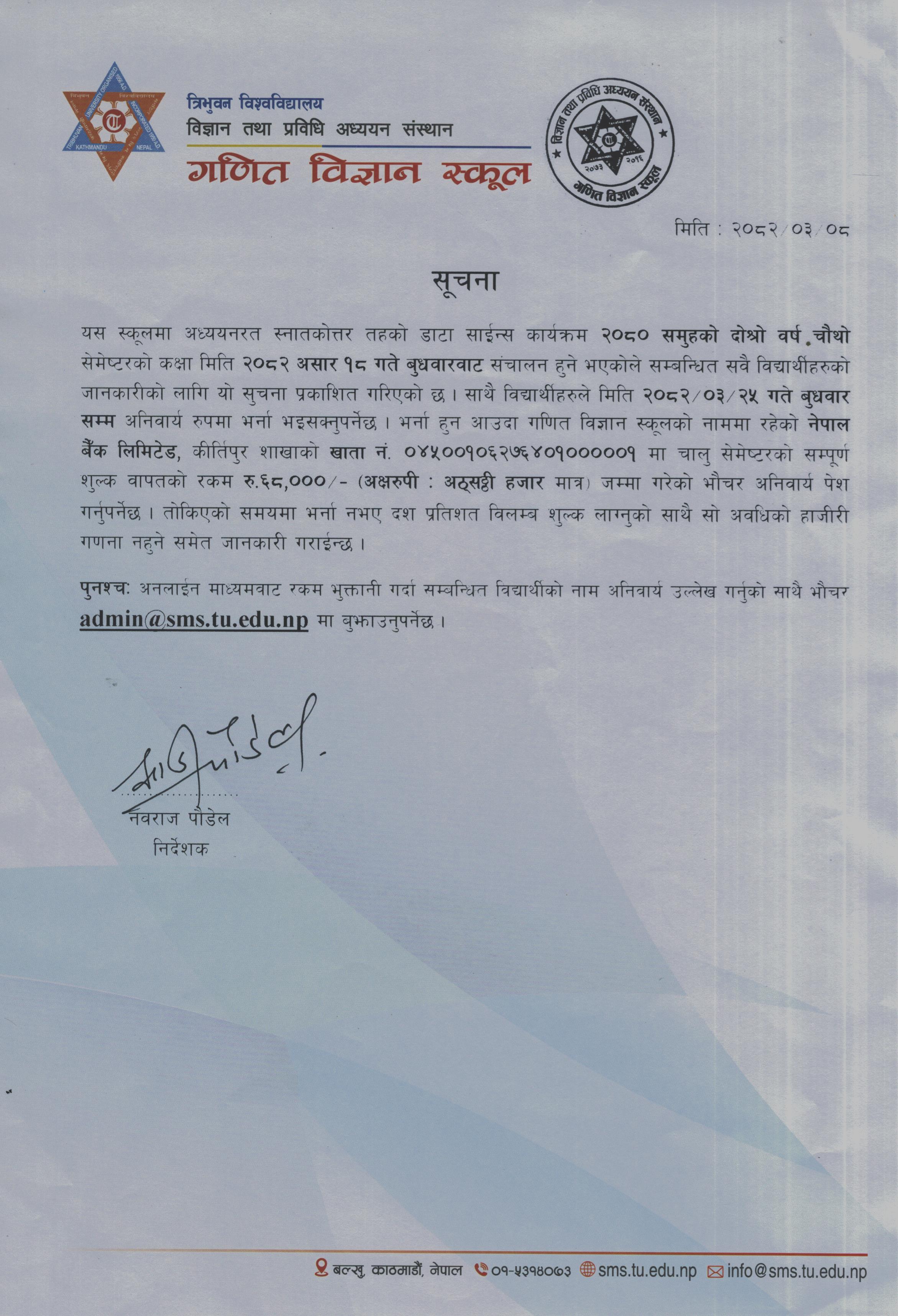 स्नातकोत्तर तह डाटा साईन्स चौथो सेमेष्टरको कक्षा सञ्चालन सम्बन्धि सुचना २०८२
