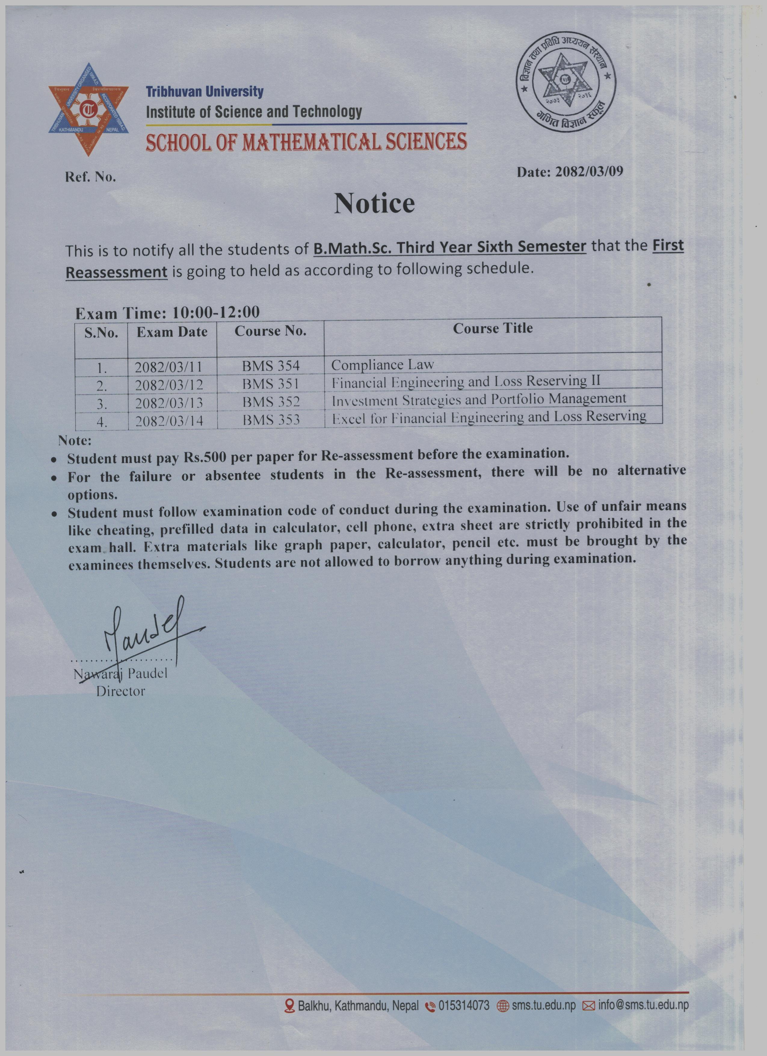 B.Math.Sc. Third Year Sixth Semester First Reassessment Exam Schedule 2082