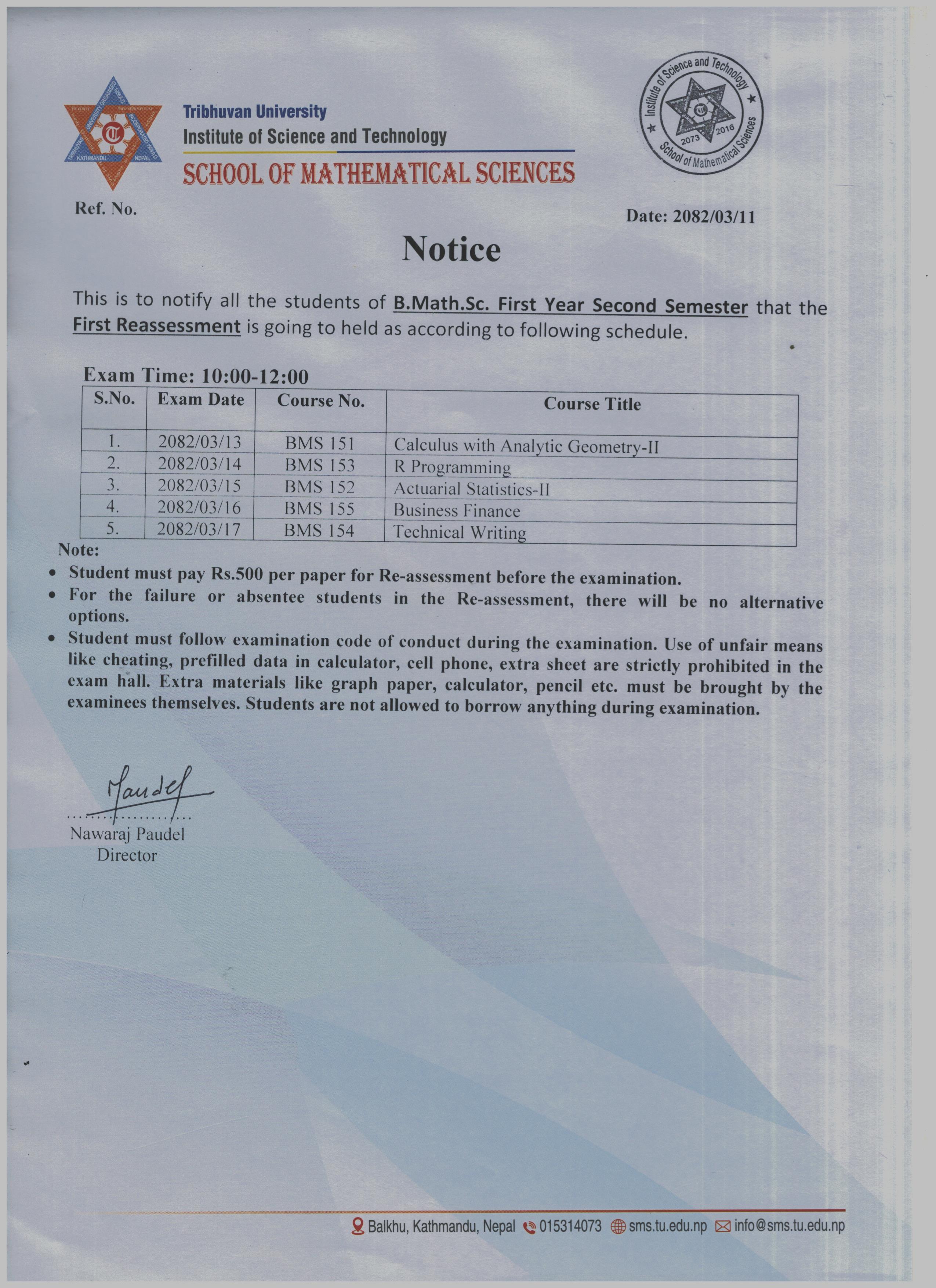 B.Math.Sc. First Year Second Semester First Reassessment Exam Schedule 2082