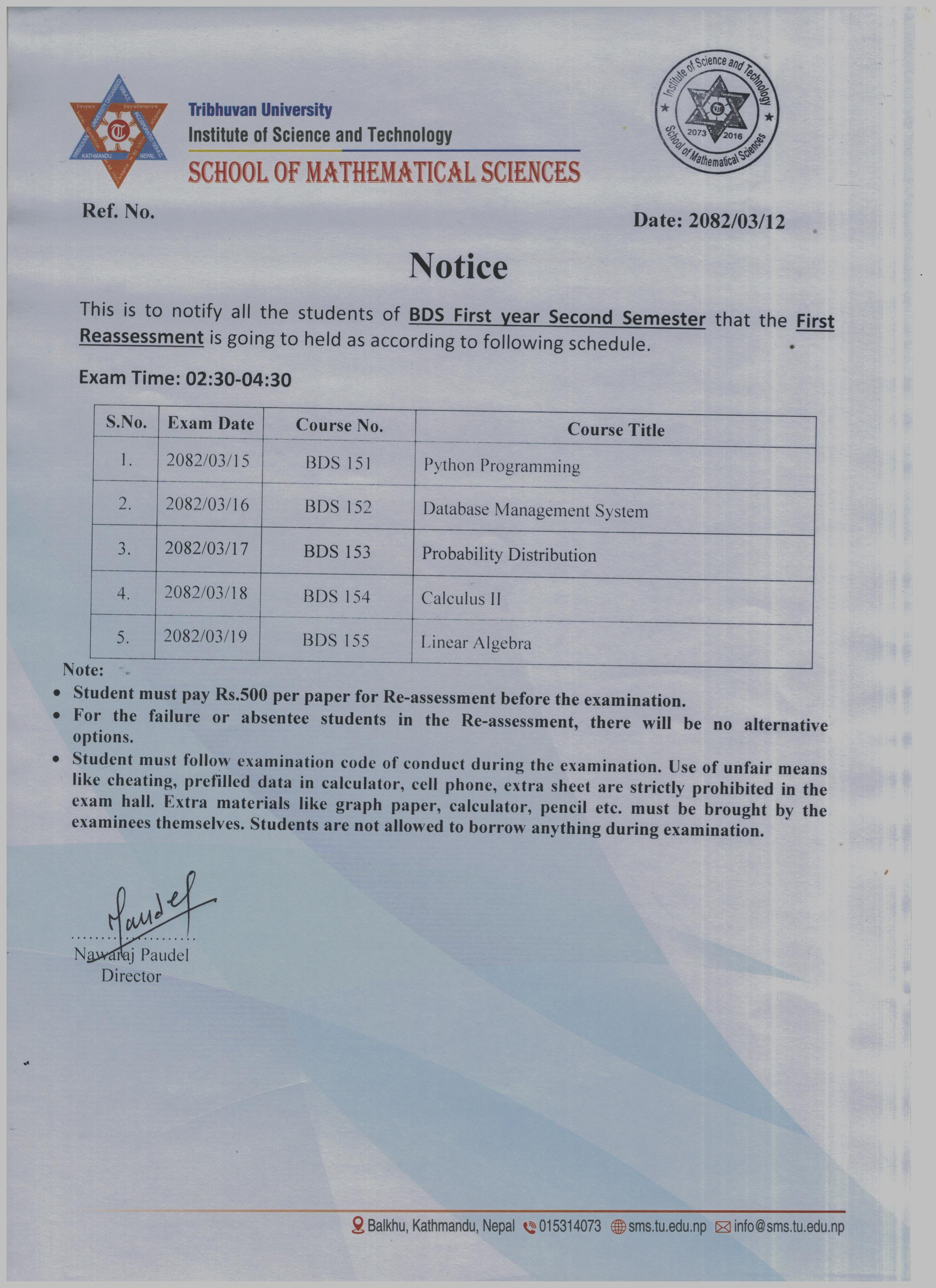 BDS First Year Second Semester First Reassessment Exam Schedule 2082