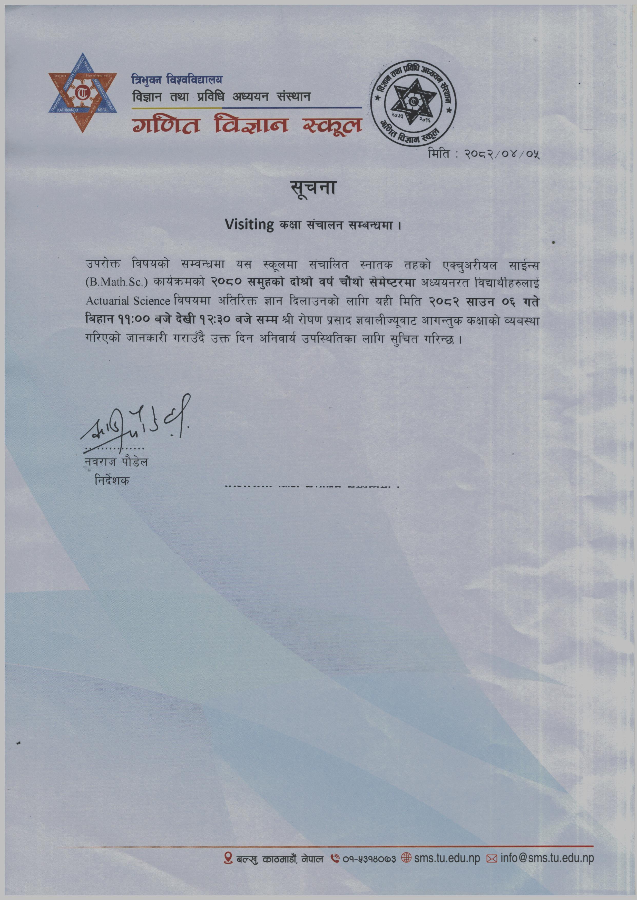 स्नातक तह B.Math.Sc. कार्यक्रम चौथो सेमेष्टरको Visiting कक्षा सम्बन्धि सुचना २०८२
