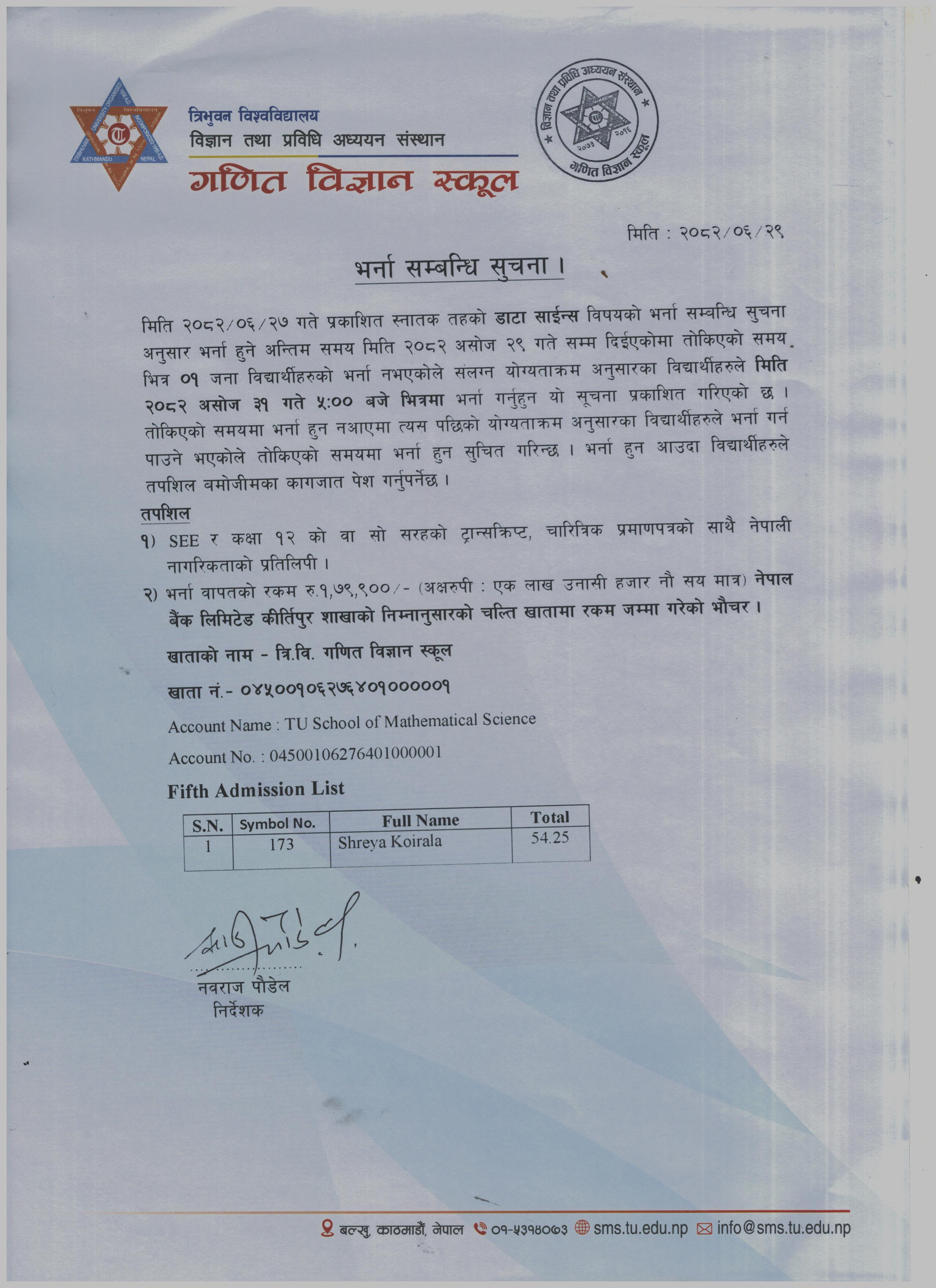 Bachelor in Data Science Sixth Admission List 2082