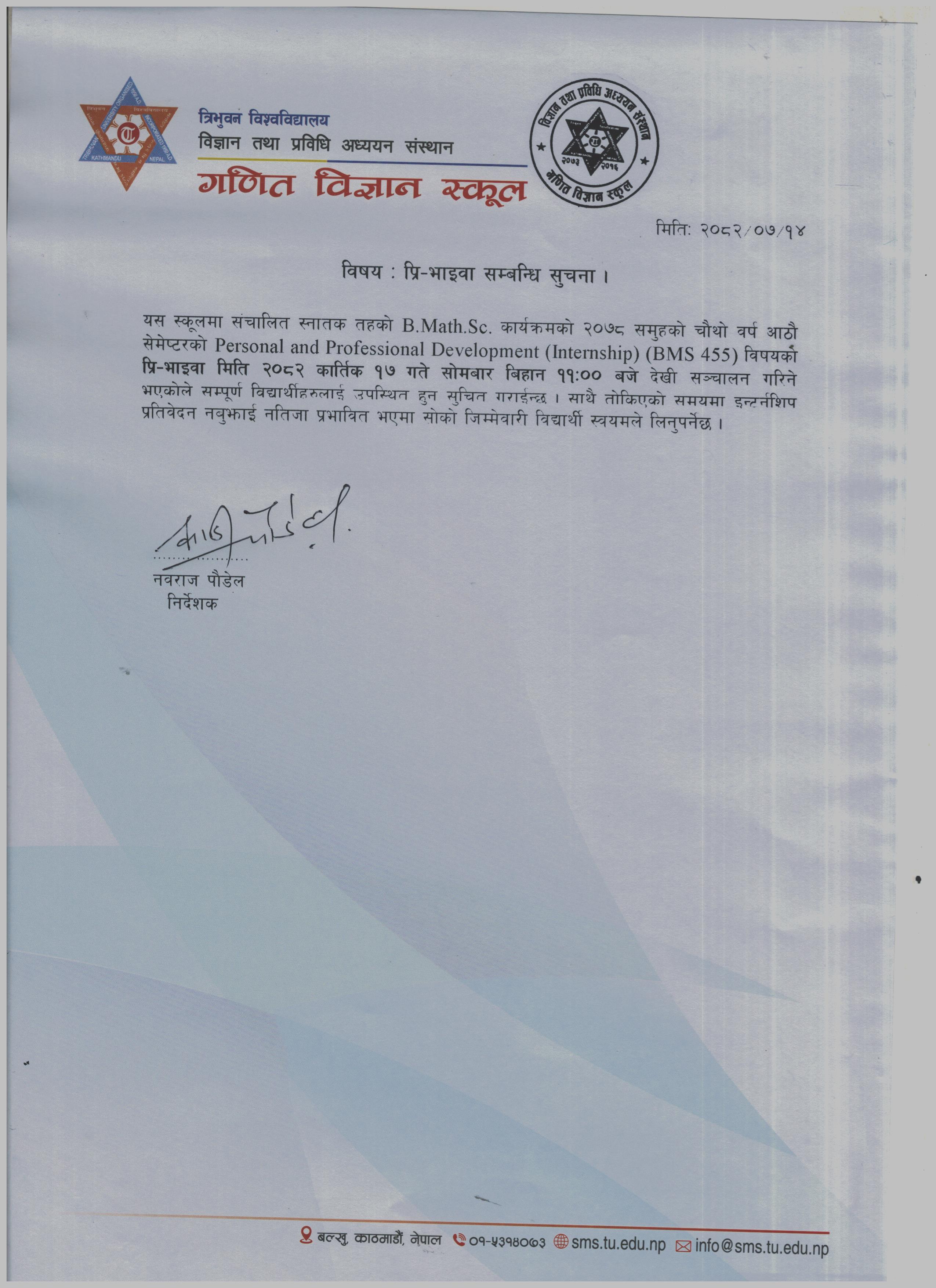 B.Math.Sc २०७८ समुह Internship को प्रि भाइवा सम्वन्धि सुचना २०८२